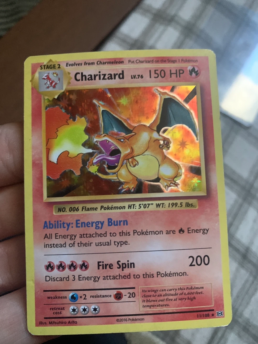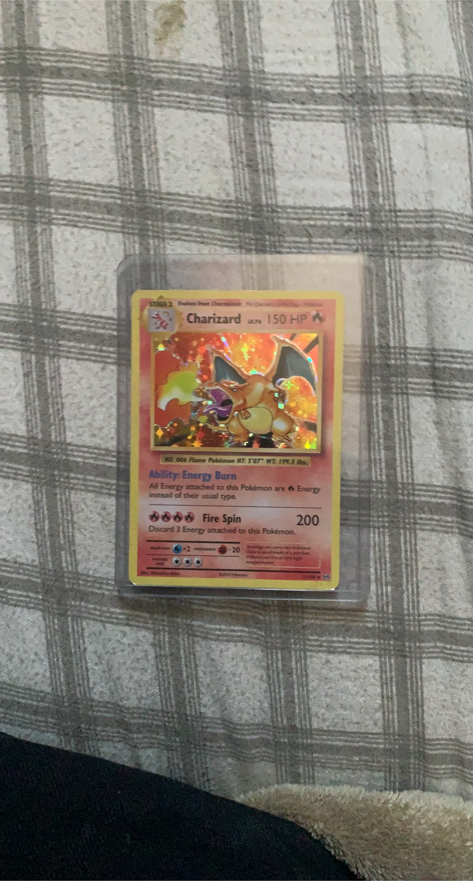 Selling a Charizard Pokemon card. It’s a reprint of the original charizard it’s worth around 150 if it was graded. It has some damage to the courners. The card number is 11/108 and it was made in 2016.