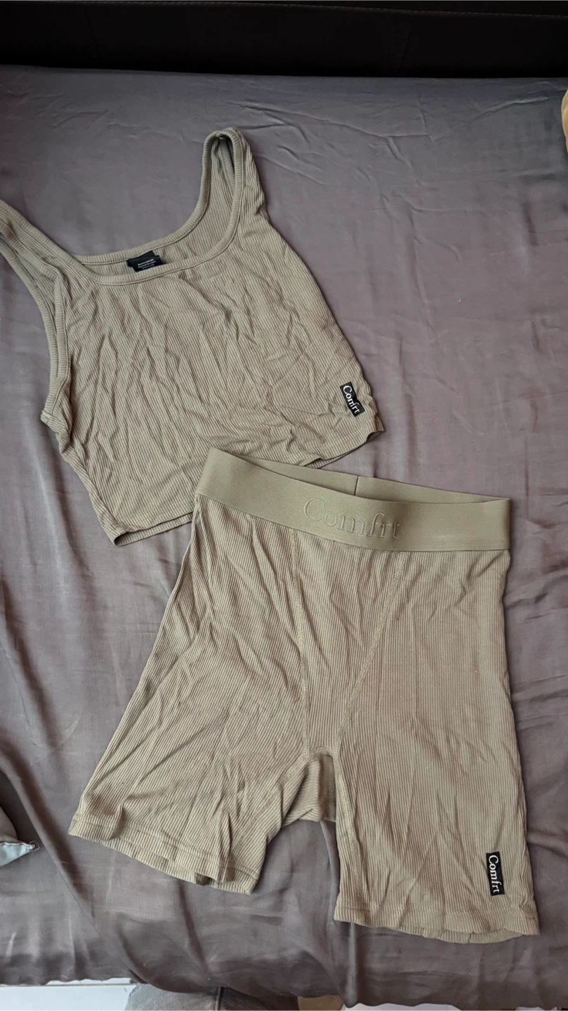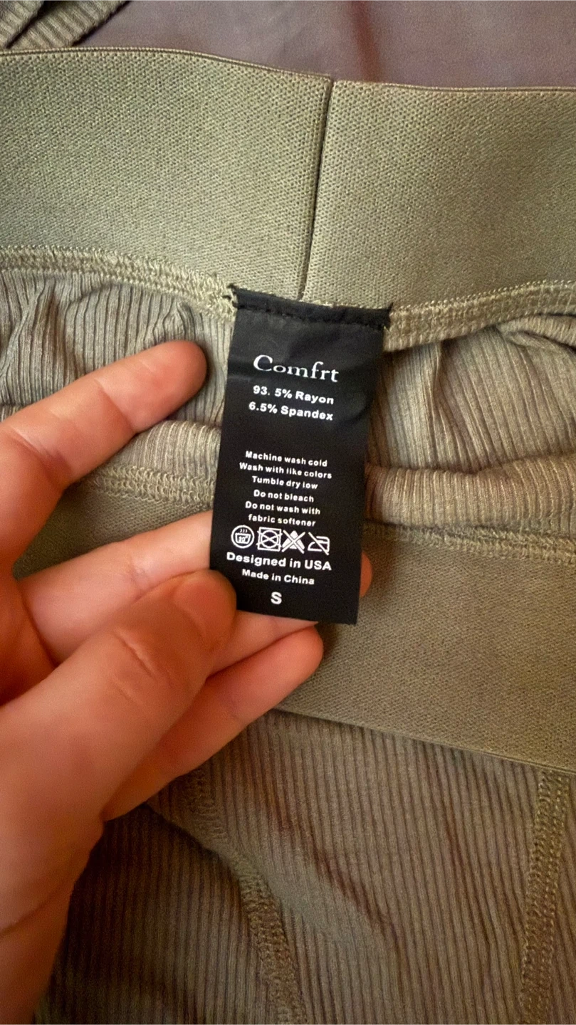 Selling a comfy ribbed lounge set from Comfrt! The set is size small and made of 93.5% rayon and 6.5% spandex. The color is a neutral olive green. Perfect for lounging around the house or a casual day out!