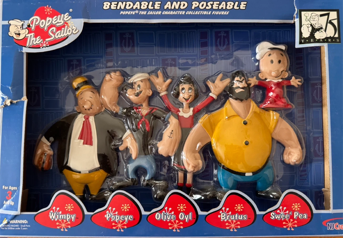 Popeye The Sailor collectible figures, bendable and poseable! This set includes Wimpy, Popeye, Olive Oyl, Brutus, and Swee'Pea. It's brand new in box and ready for a new home!