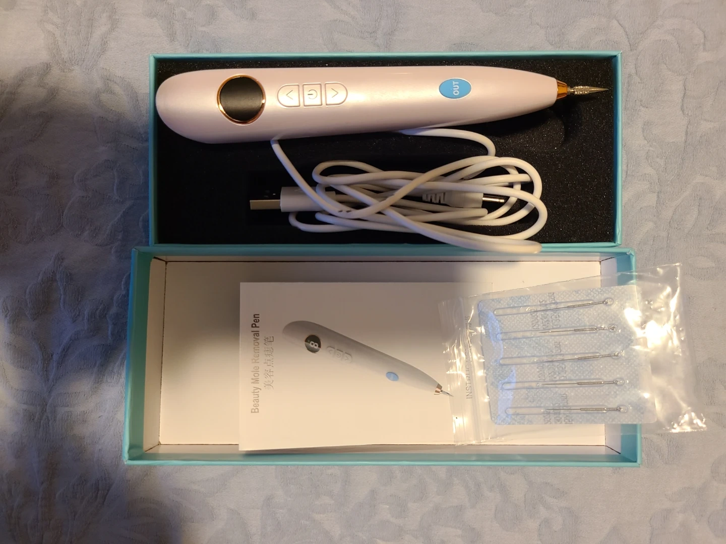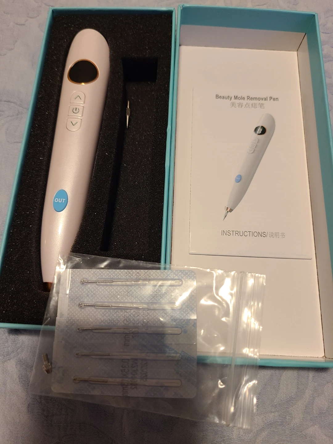 Selling a new beauty mole removal pen, complete with needles and a charger! It features adjustable digital strength and a needle light for precision. The pen is portable and comes in its original box with instructions
