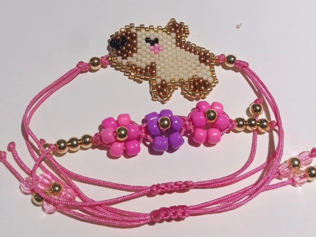Handmade bracelet! It features a beaded capybara and flower design. The bracelet is pink with gold accents.