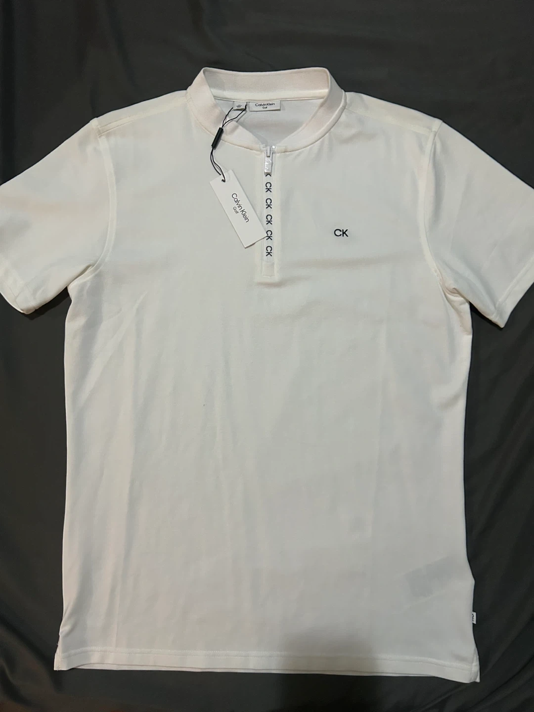 Selling a Calvin Klein Golf polo shirt in white! The shirt features a unique zipper design with the CK logo. Perfect for a day on the golf course or a casual outing