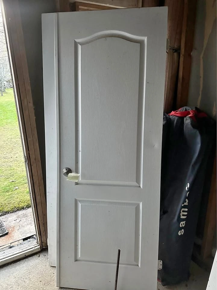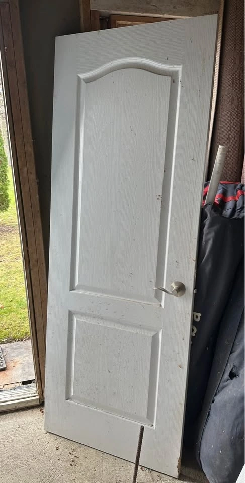 Price is firm. $50 for the pair of double closet doors. White wood doors with silver handles. Must be able to come and remove yourself. 30x80 inches. These 2 doors belong together. They were closet doors (1 has meeting stile/rabbeted stile). One door is made slightly wider with a rebated (stepped) edge so that when the two doors close, that edge overlaps the other door. One door has some damage to the corner, see image attached. Has been sitting in a shed - needs to be dusted.
