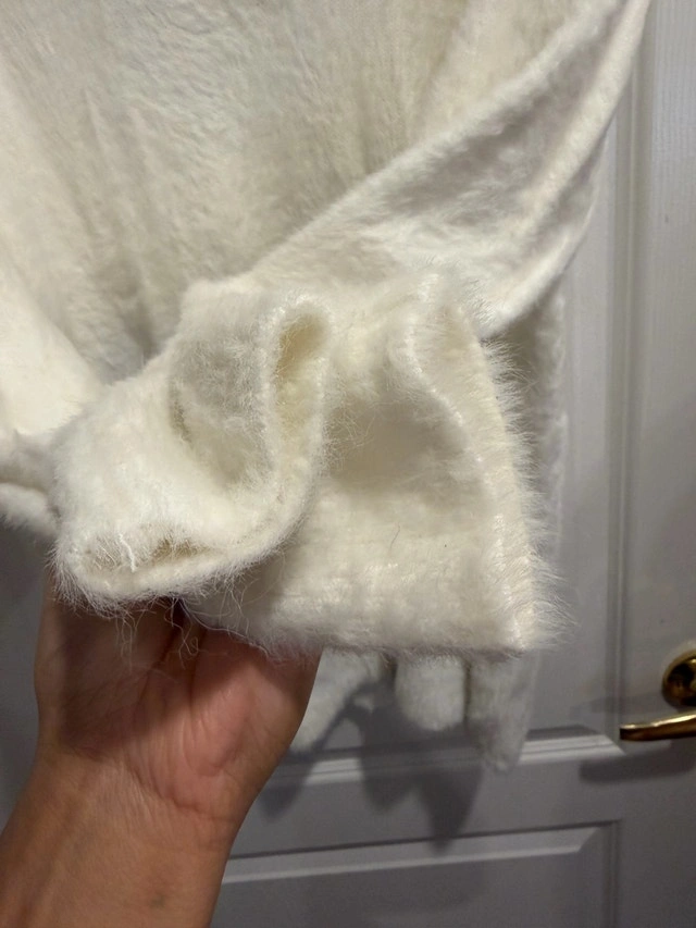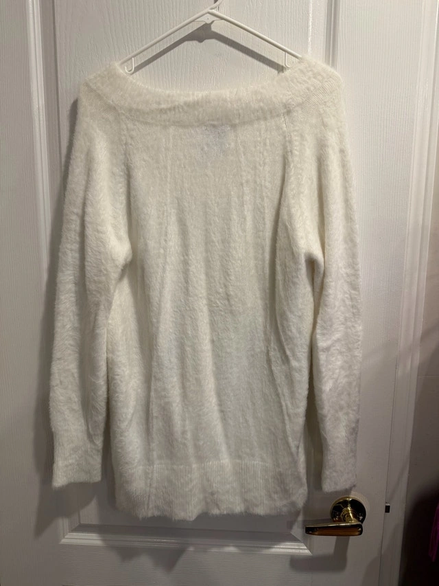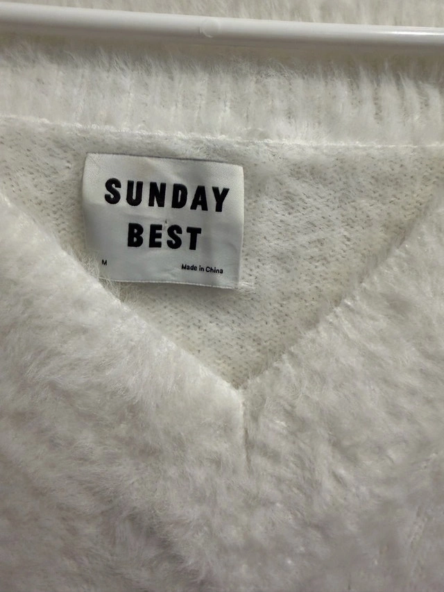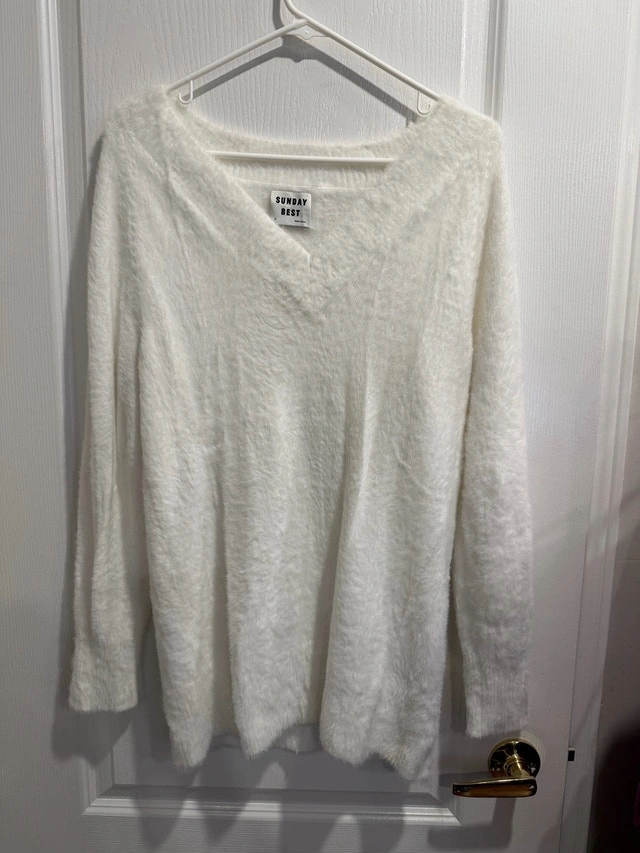 Specifications: * Brand: Sunday Best * Size: Medium * Colour: White * Material: Soft, fuzzy knit If the ad is still up, the sweater is still available and waiting to find its new home!