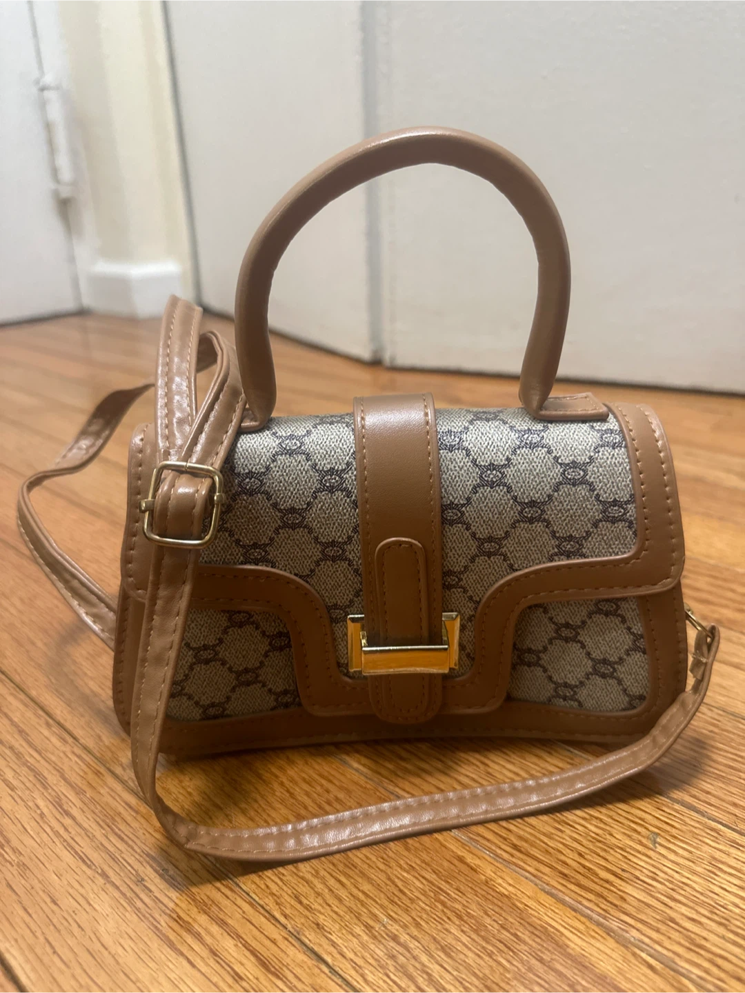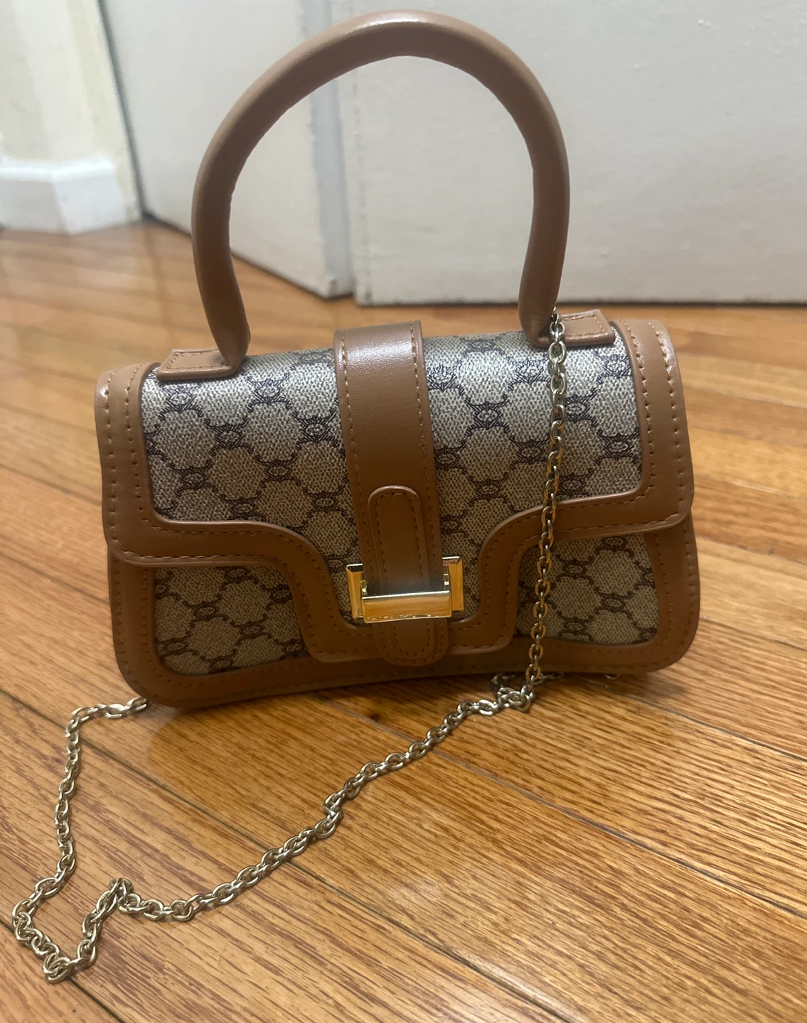 This is a cute mini top handle bag in brown! It's perfect for carrying small items and adding a touch of style to your outfit