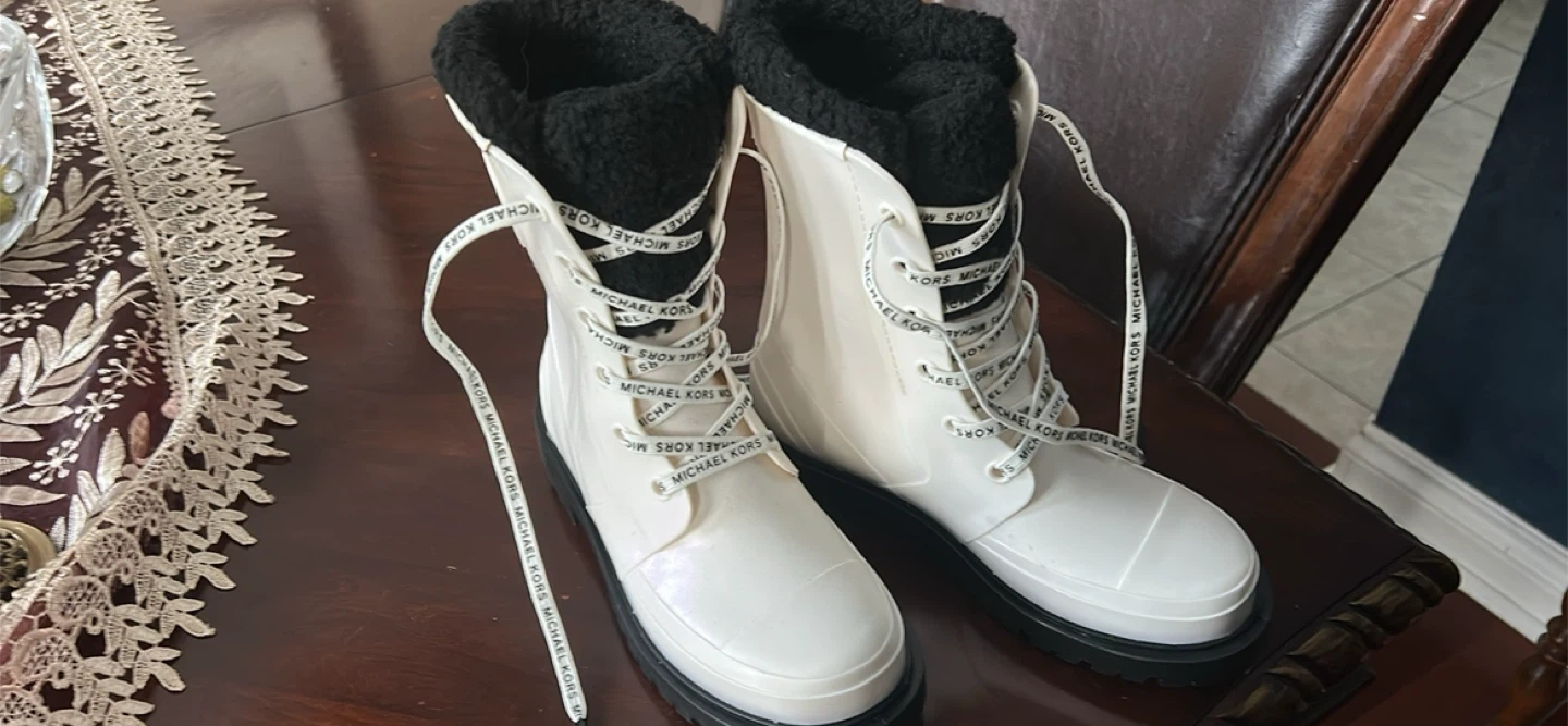 These Michael Kors winter boots are ready for the snow! They're a stylish white colour with black faux fur lining. The laces have the Michael Kors logo printed on them, adding a unique touch to these cozy boots
