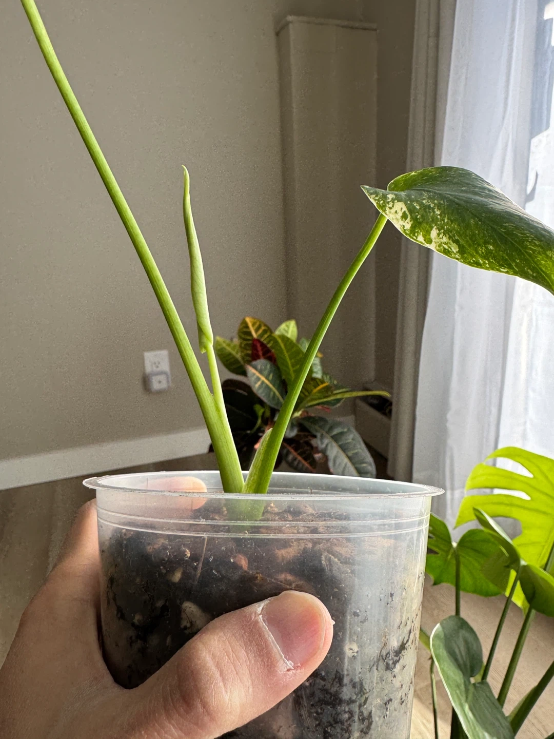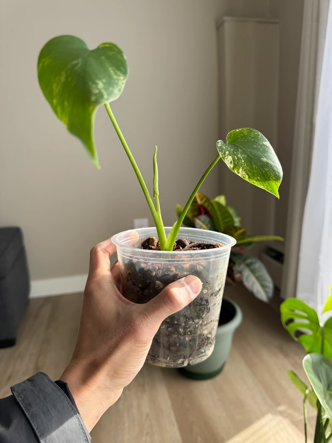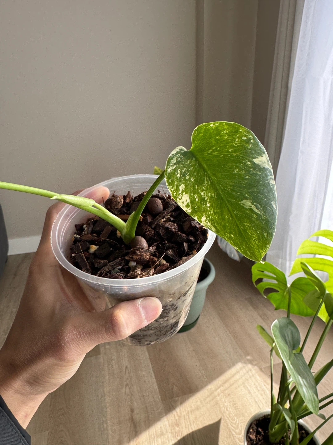 Selling a lovely Monstera Deli white Mint plant! It's currently potted in a clear plastic container with soil and wood chips. This plant would make a great addition to any indoor garden