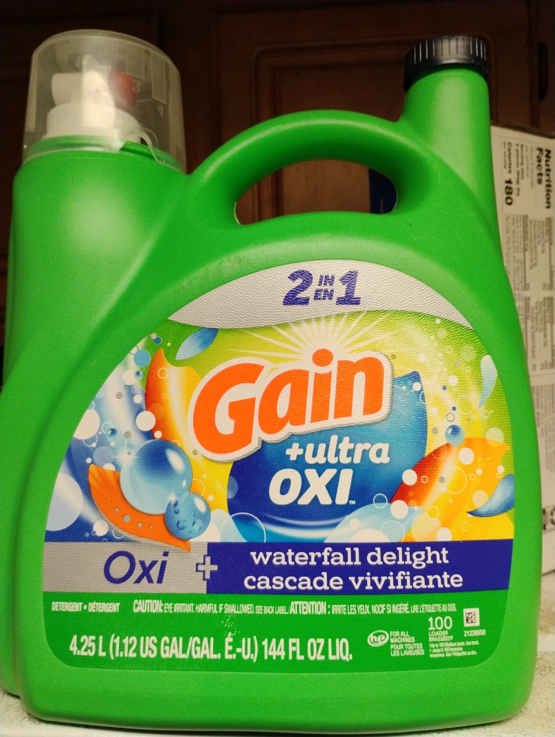 Selling a 4.25 L bottle of Gain +Ultra Oxi laundry detergent in the Waterfall Delight scent. It's a 2-in-1 formula with Oxi boost for extra cleaning power. Perfect for all machines and up to 100 loads