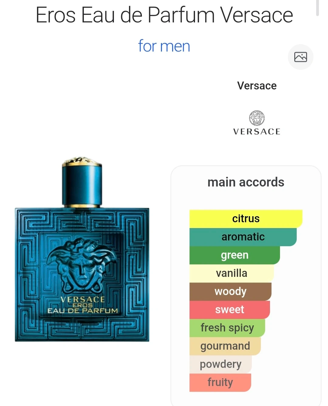 Selling a 100mL bottle of Versace Eros Eau de Parfum. Perfect for trying out the scent before committing to a full-size bottle! The fragrance has citrus, aromatic, and green main accords.