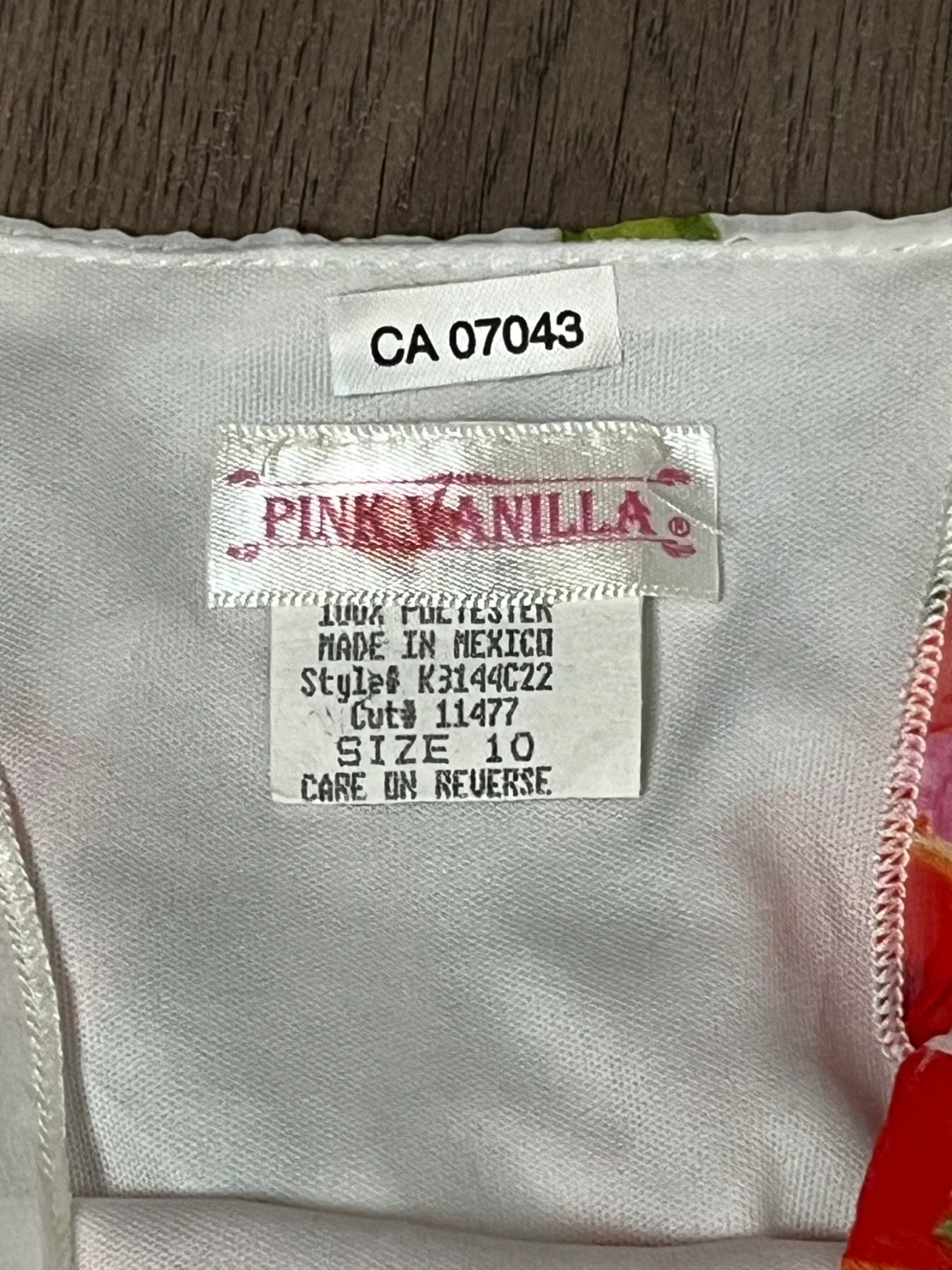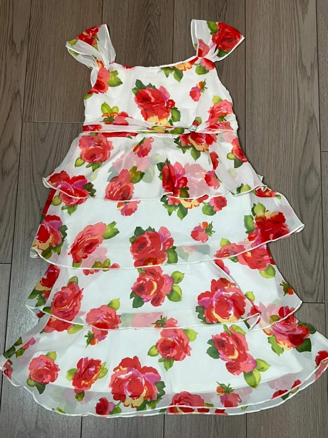 This is a Pink Vanilla floral dress, perfect for a special occasion or just feeling fancy! The dress is a size 10 and made of 100% polyester. It features a beautiful red rose pattern on a white background, with a tiered design that adds a fun and flirty touch.