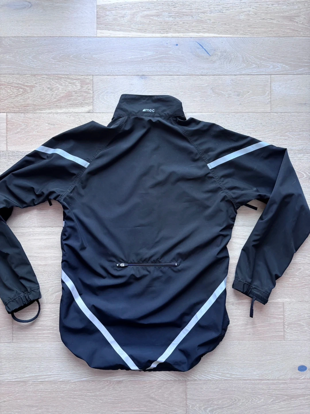 Large MEC jacket, tailored cut that fits over layers but doesn't billow in the wind when you're riding.