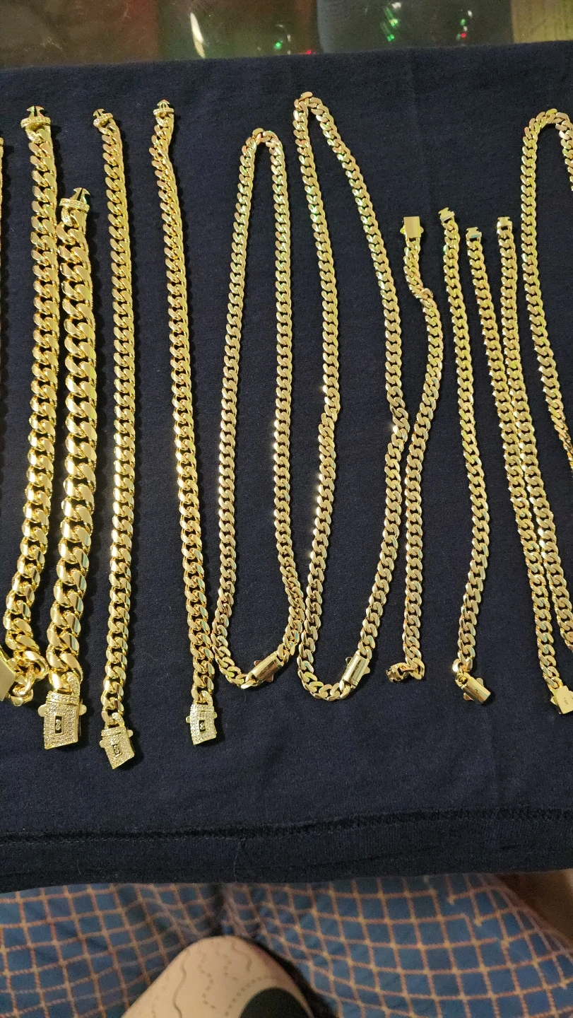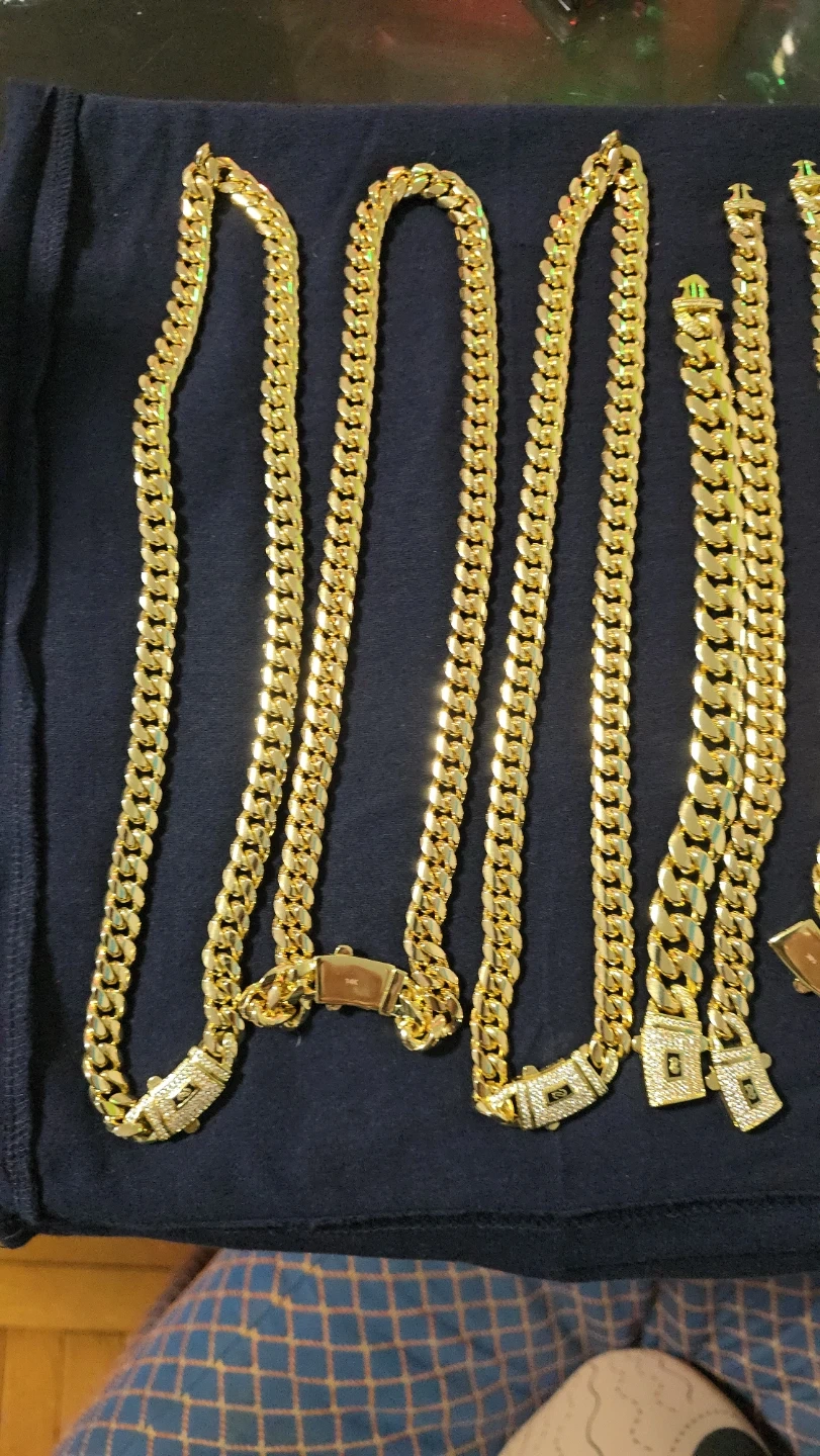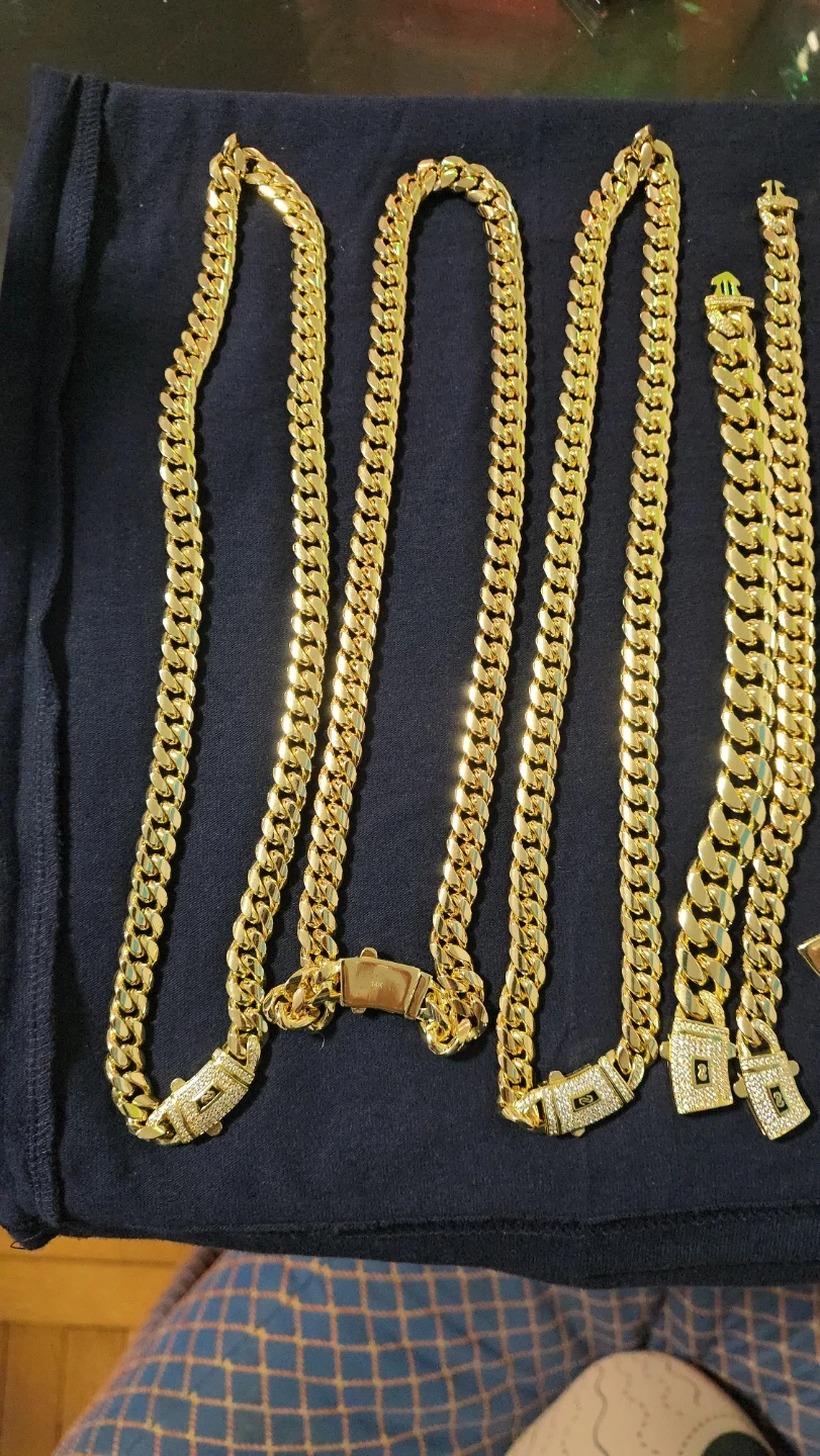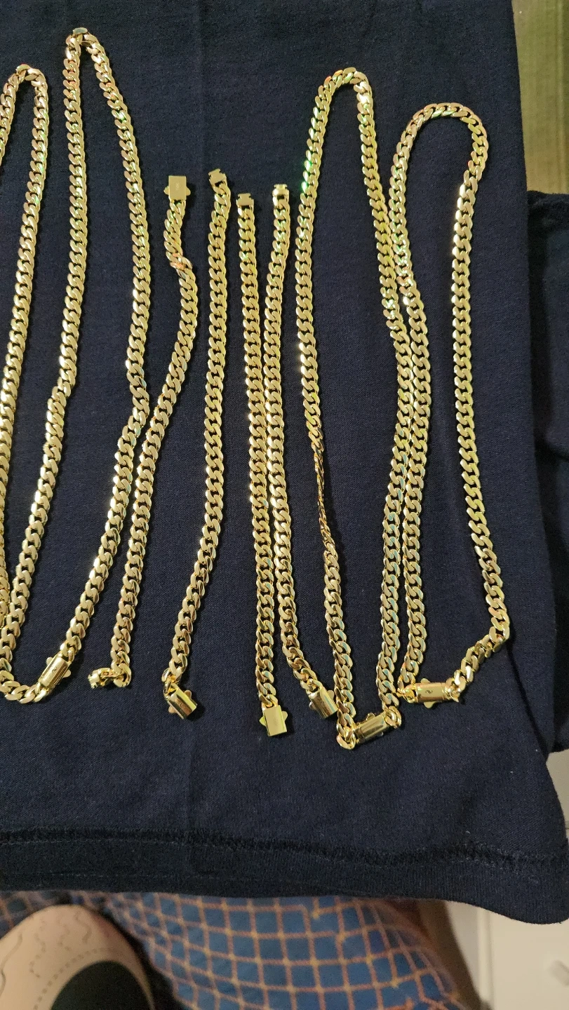 Selling a set of gold chains and bracelets. They have a classic curb link design. Perfect for adding a touch of style to any outfit!