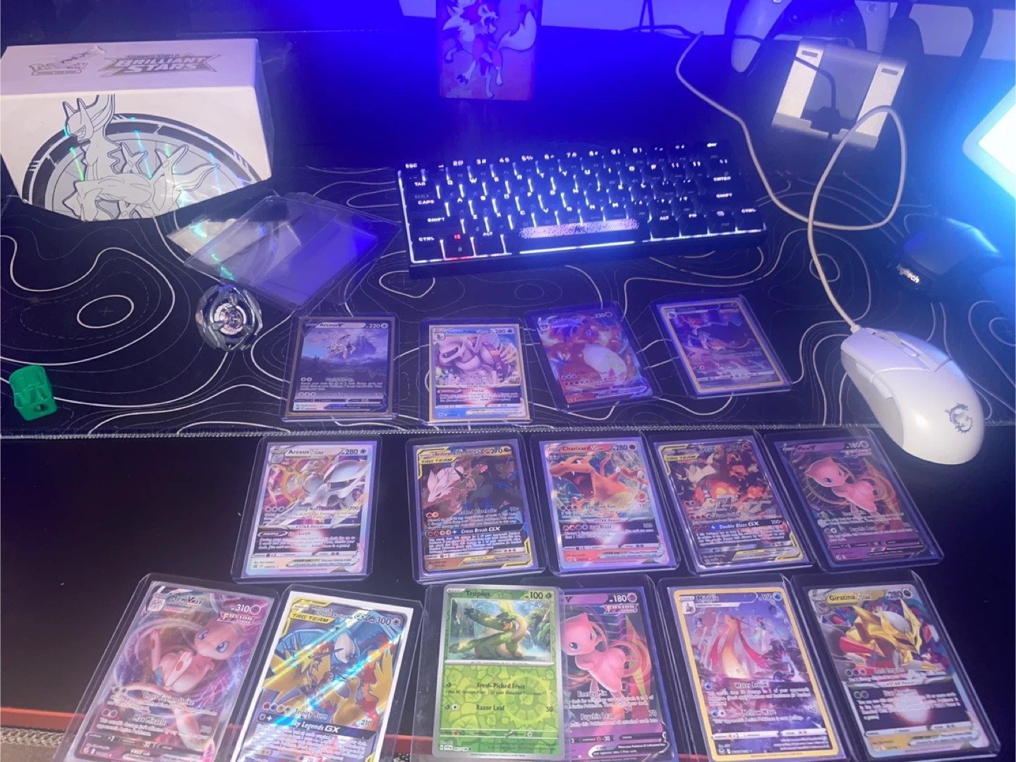Selling a variety of Pokemon cards, including Arceus V, Charizard, and Mew VMAX! All cards are in great condition and sleeved for protection. Perfect for collectors or players looking to add some powerful cards to their deck. There's also a Brilliant Stars box!