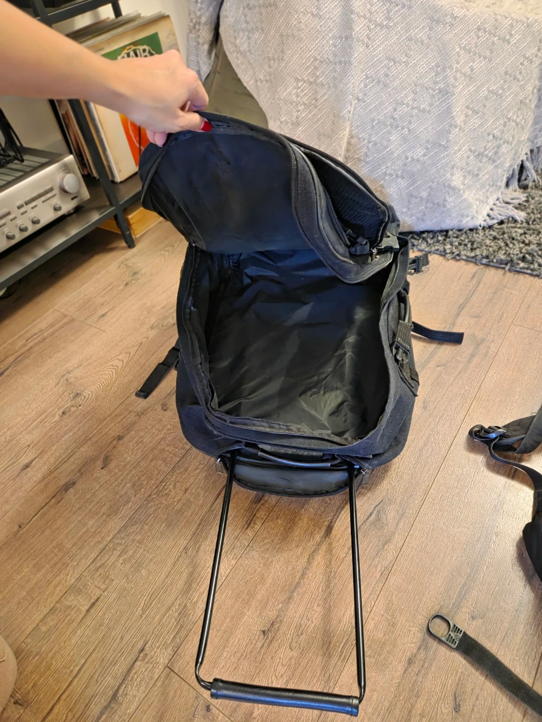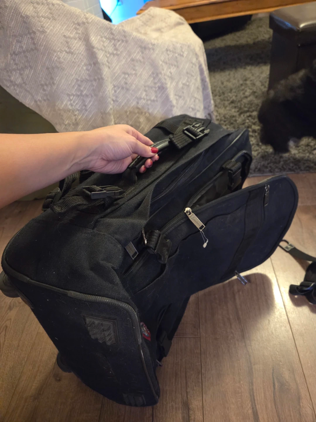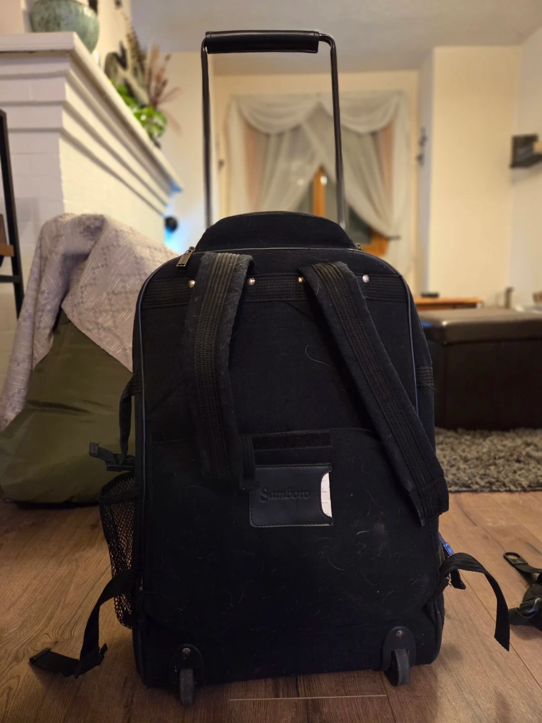 This is a Samboro wheeled backpack in black. It's in great shape and ready for its next adventure! It has a retractable handle and backpack straps for easy carrying. Lots of compartments for organization too. A bit dusty, but otherwise in excellent condition. All zippers and buckles work well. No rips.