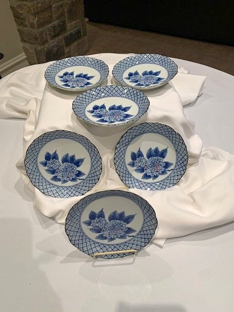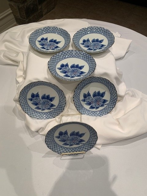 A set of 6 beautiful dessert plates, 7 1/2" wide, with a stunning Blue Hydrangea motif. No chips or cracks. From a smoke-free, pet-free home. Located in Richmond Hill near Bathurst and King Rd.