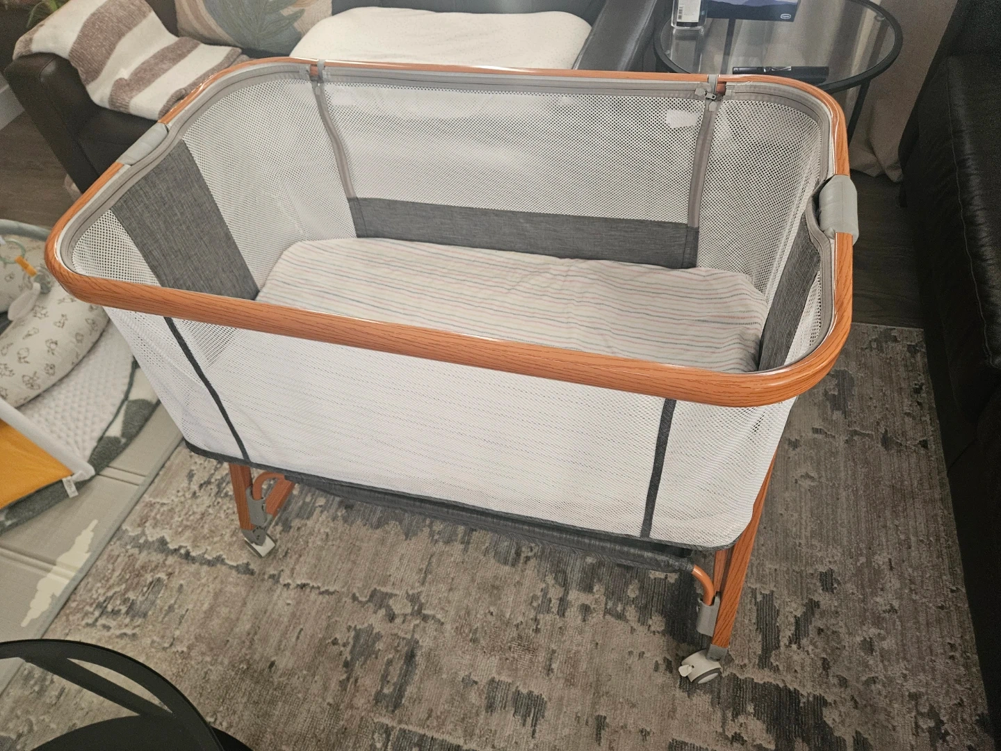 Selling a gently used bassinet in great condition! It features adjustable height settings, making it easy to adapt to your needs. The bassinet is a neutral grey and white colour, and has a sturdy frame with wheels for easy movement. It also includes a comfortable mattress pad. Perfect for keeping your little one close by!