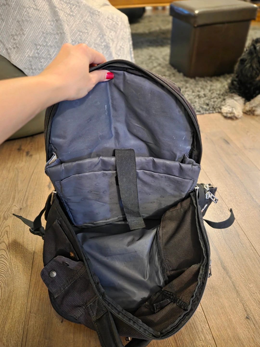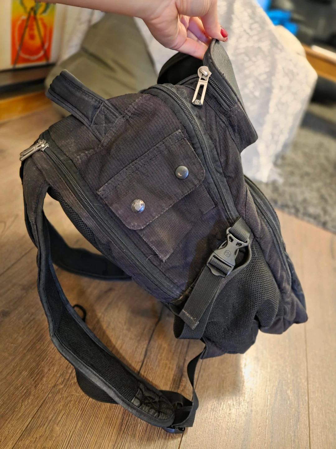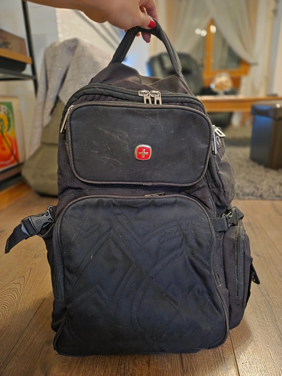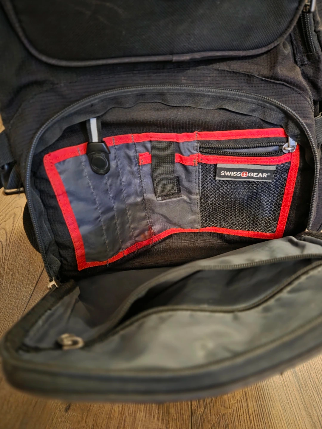 Selling a used black Swiss Gear backpack. It's in good condition, aside from a bit of wear on the front corners (pictured in last image) and has lots of pockets and compartments for storage. Perfect for school, work, or travel! Zippers and buckles all in good shape. Just needs a little wipe down.