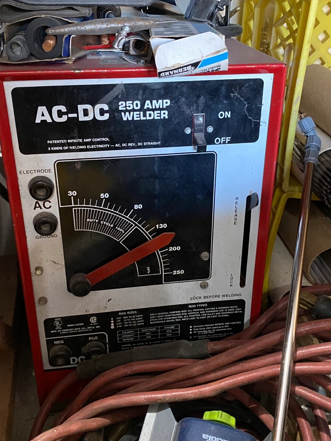 Selling an AC-DC 250 AMP Welder. It uses 3 kinds of welding electricity - AC, DC REV, DC STRAIGHT. Please take a look at the photos for details! Everything is included that you see in the photos, rods, cables, helmet all of it.