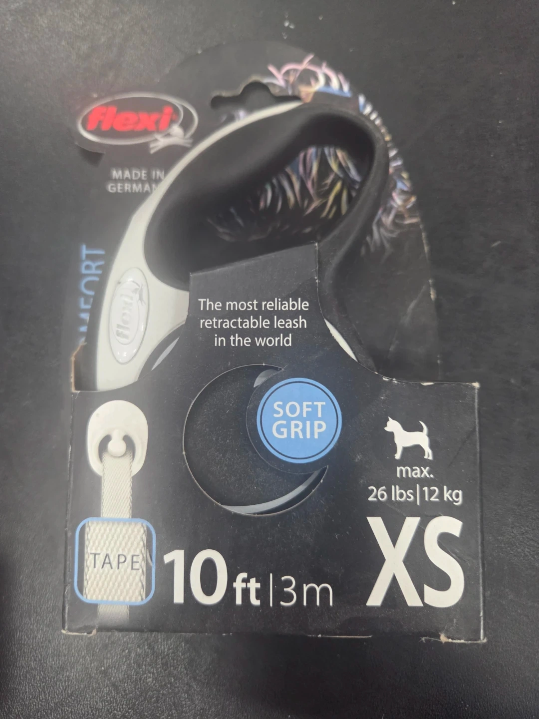 Selling a Flexi Comfort retractable dog leash in size XS. It extends up to 10ft (3m) and is suitable for dogs up to 26 lbs (12 kg). It features a soft grip for comfortable handling. The box is included!