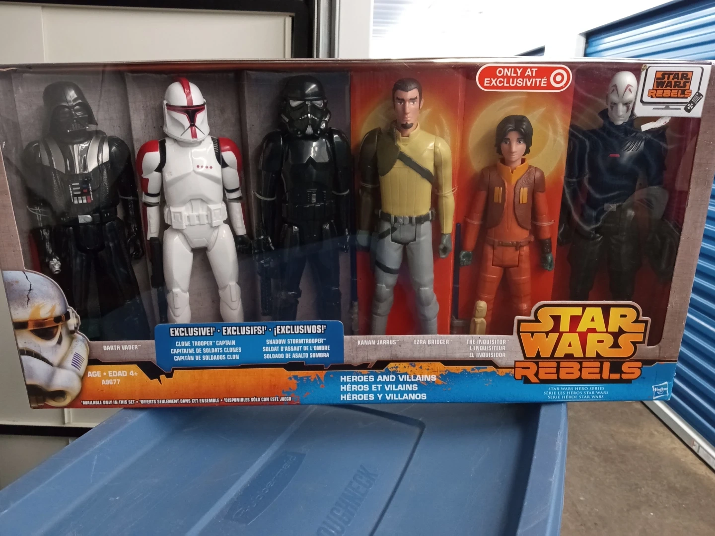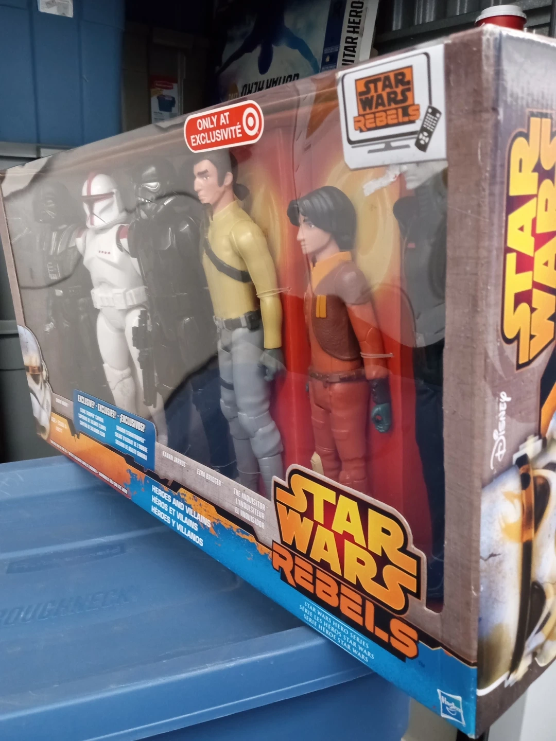 This is a Star Wars Rebels Heroes and Villains action figure set. It features Darth Vader, Clone Trooper Captain, Shadow Stormtrooper, Kanan Jarrus, Ezra Bridger, and The Inquisitor. The set is exclusive to Target. 2014