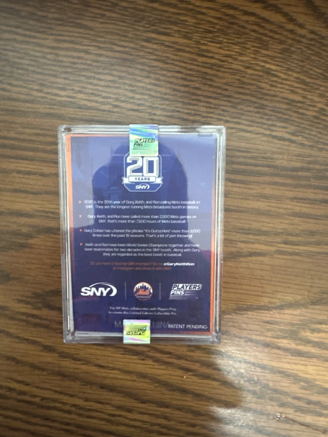 Selling a limited edition collectible pin featuring Ron Darling's Textbook. The pin celebrates 20 years of SNY. It's in great condition and comes in its original case
