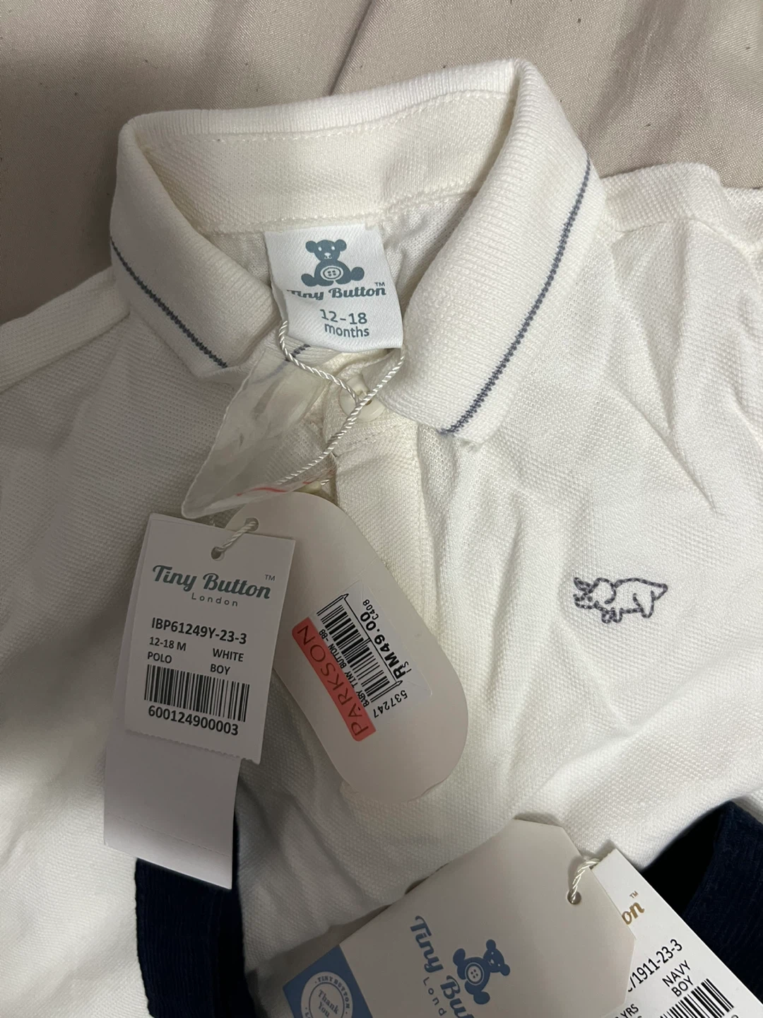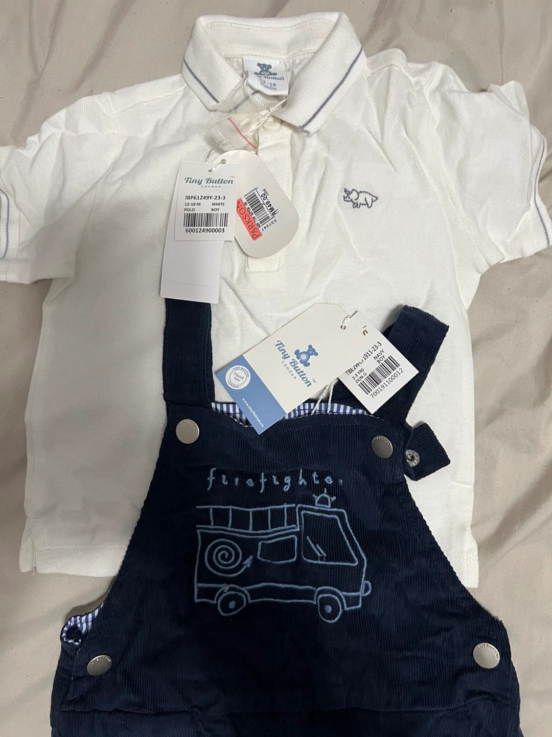 This adorable Tiny Button London set is brand new with tags! It includes a white polo shirt and navy overalls with a cute firefighter design. The polo is size 12-18 months. Perfect for your little one!