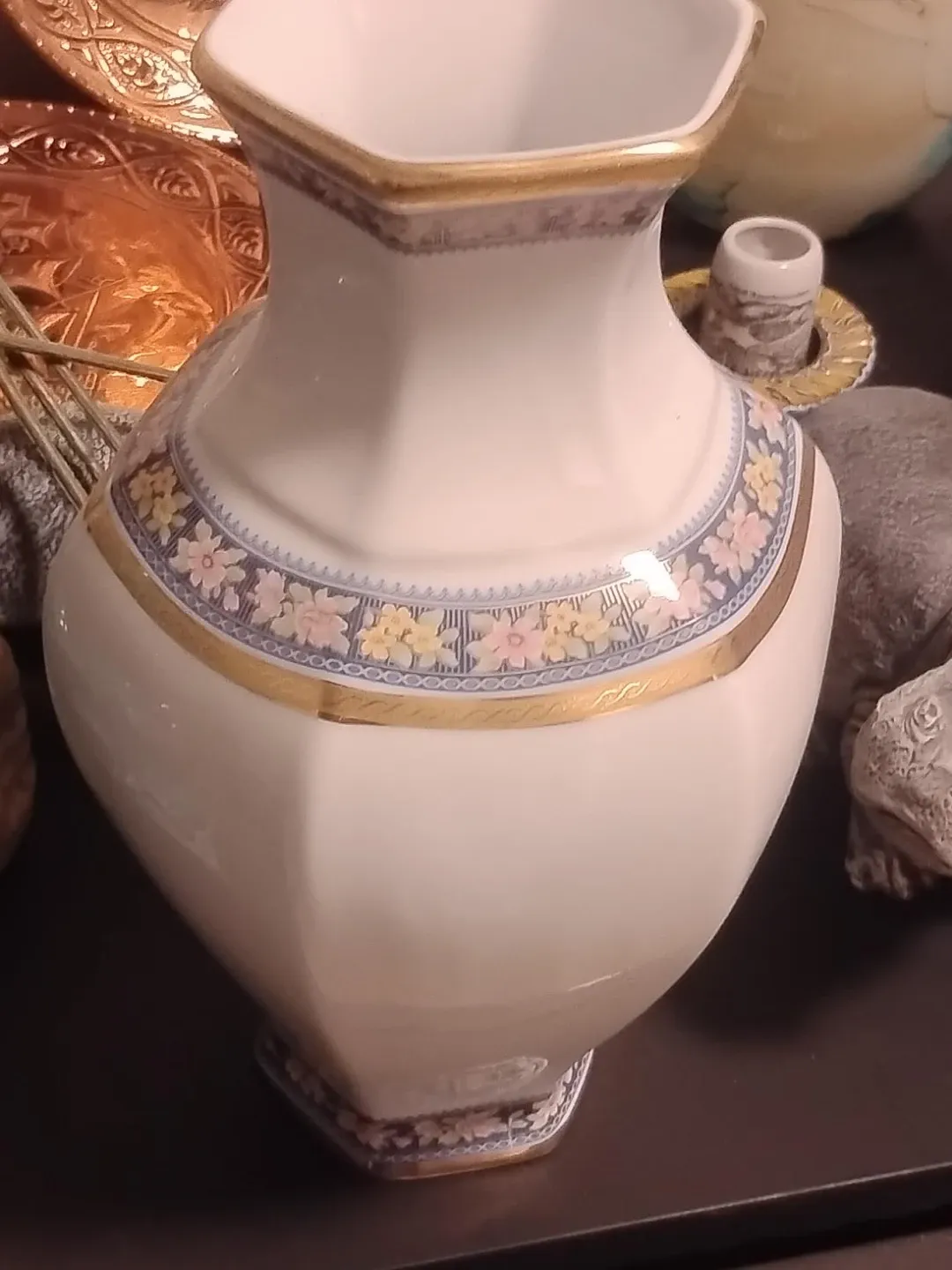 A lovely vase with a delicate floral pattern and gold trim. It's perfect for adding a touch of elegance to any room. Great for displaying your favourite flowers or as a standalone decorative piece!