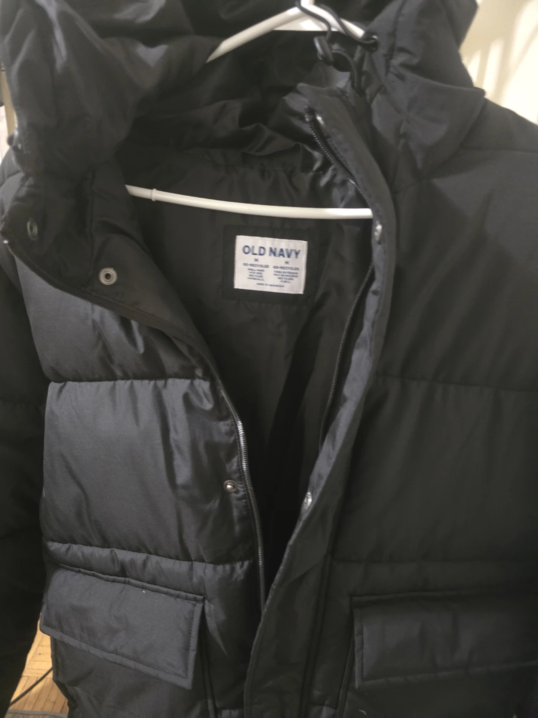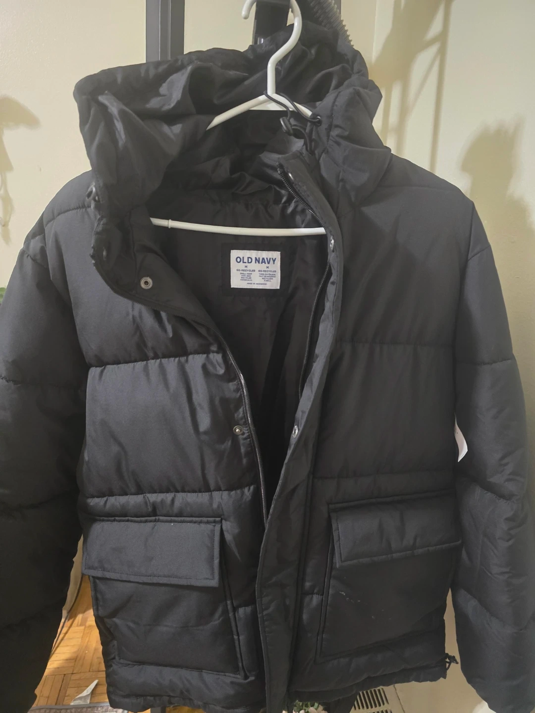 Selling a new Old Navy black puffer jacket in size medium. and perfect for staying warm this winter! The jacket features a hood and functional pockets.