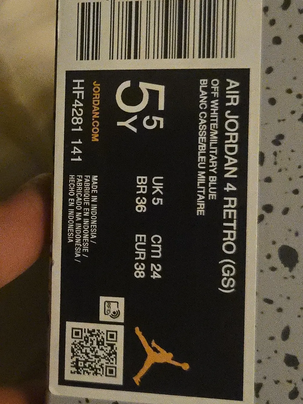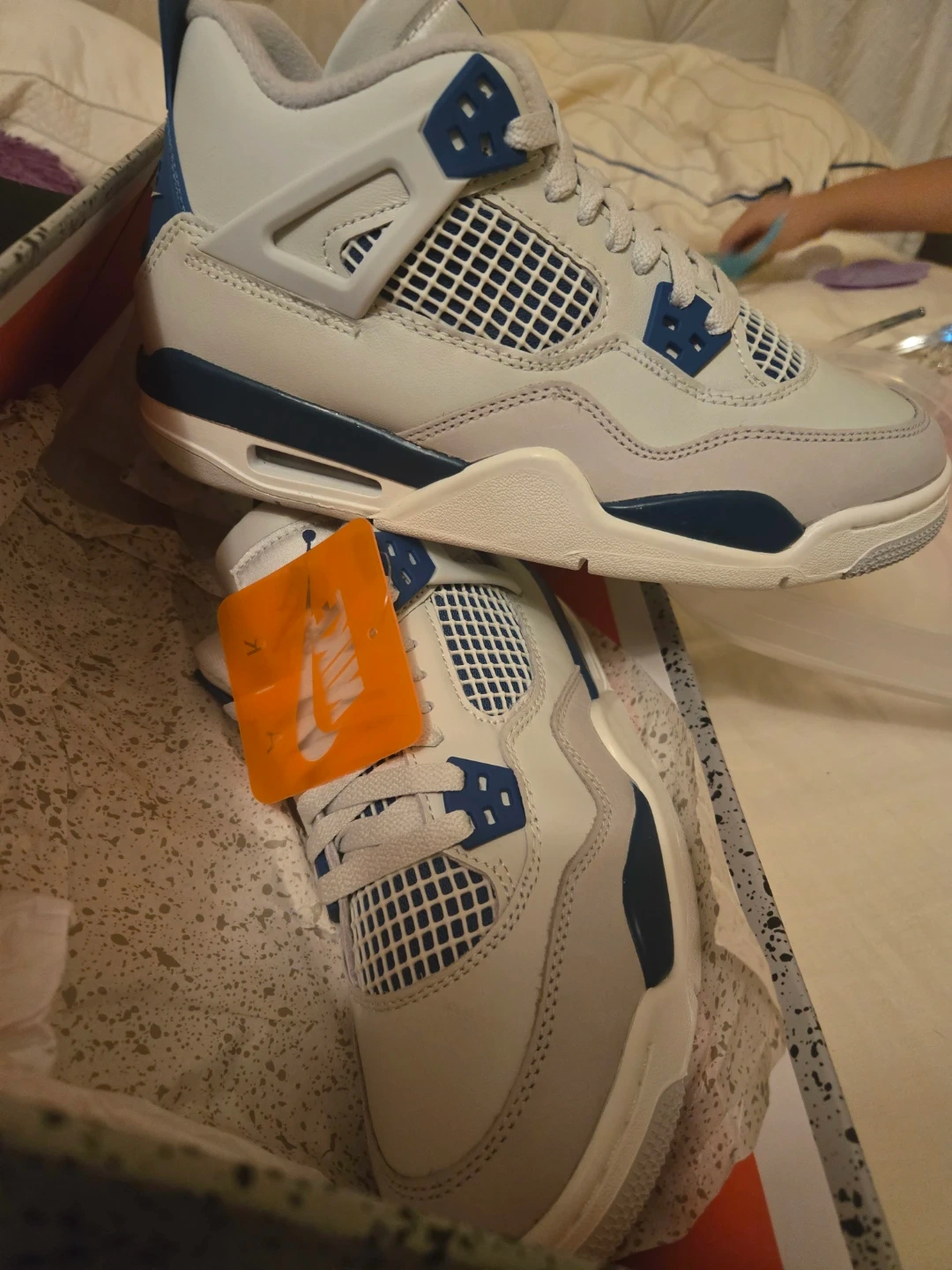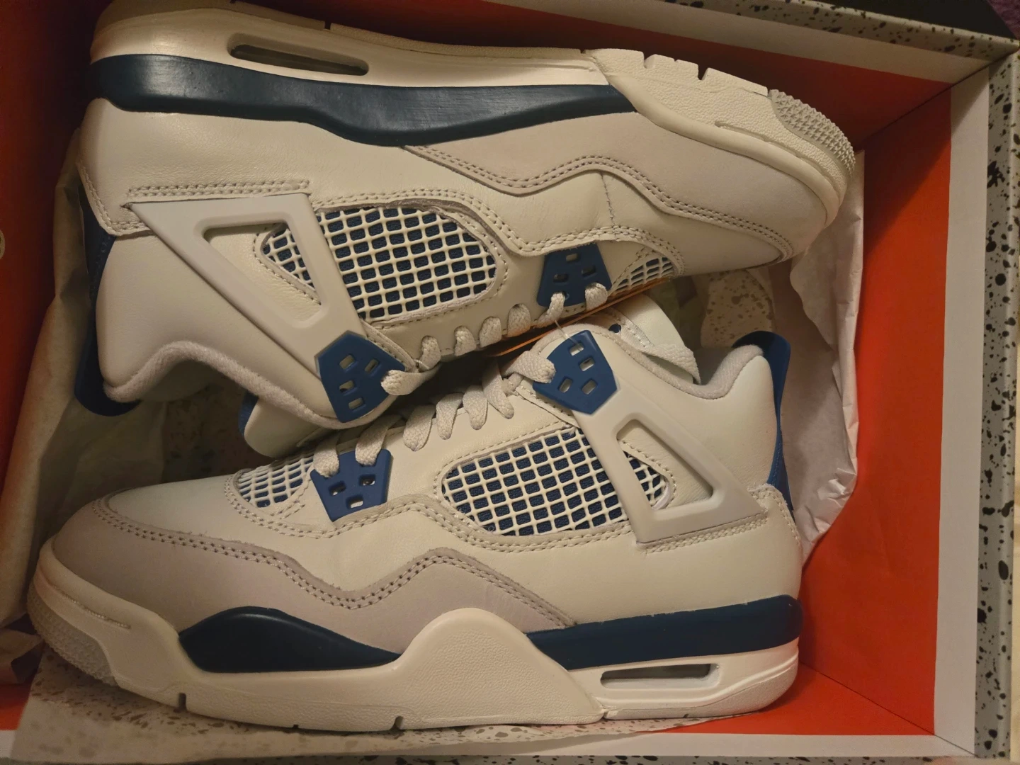 Selling a pair of Nike Air Jordan 4 Retro (GS) in Off White/Military Blue. They are a size 5.5Y. Comes with the original box
