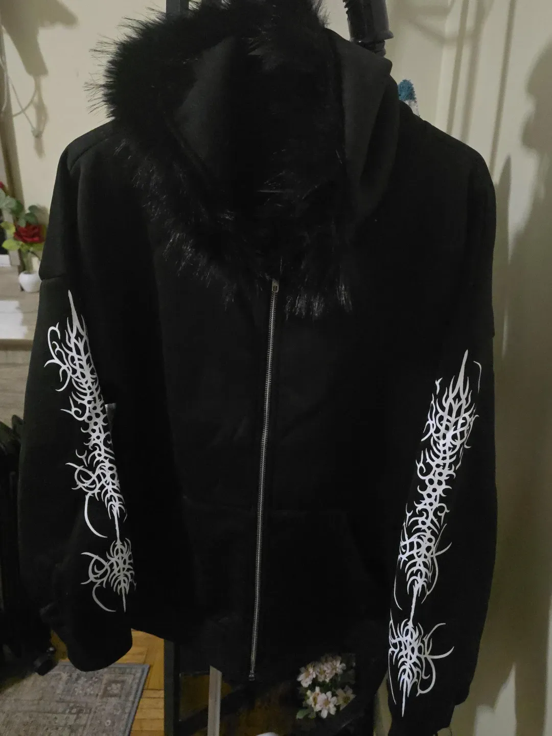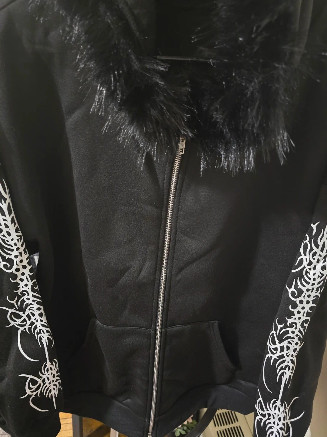 Selling a new black zip-up hoodie with a fur trim around the hood and unique white designs on the sleeves. It's new and perfect for adding a bit of edge to your wardrobe!