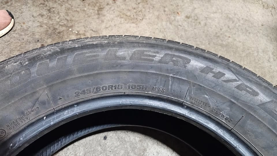 Selling four Bridgestone all season tires, size 245/60/18, for $100. These are similar to sizes 235/65/18, 255/60/18, and 265/55/18. They may fit vehicles such as Acura MDX, Chevrolet Trailblazer, Ford Edge, Explorer, GMC Envoy, Honda Passport, Hyundai Palisade, Infiniti QX60, Jeep Grand Cherokee, Kia Telluride, Lexus RX350, Lincoln Aviator, Mazda CX9, Subaru Ascent, Toyota Highlander, and VW Atlas, among others. This list is for reference only, and buyers are responsible for verifying fitment for their specific vehicle.