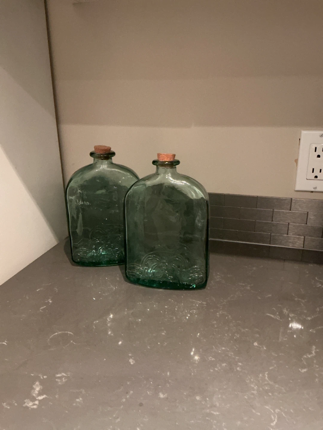 Selling a set of two decorative green glass bottles. They have a unique design and would look great as part of your home decor!