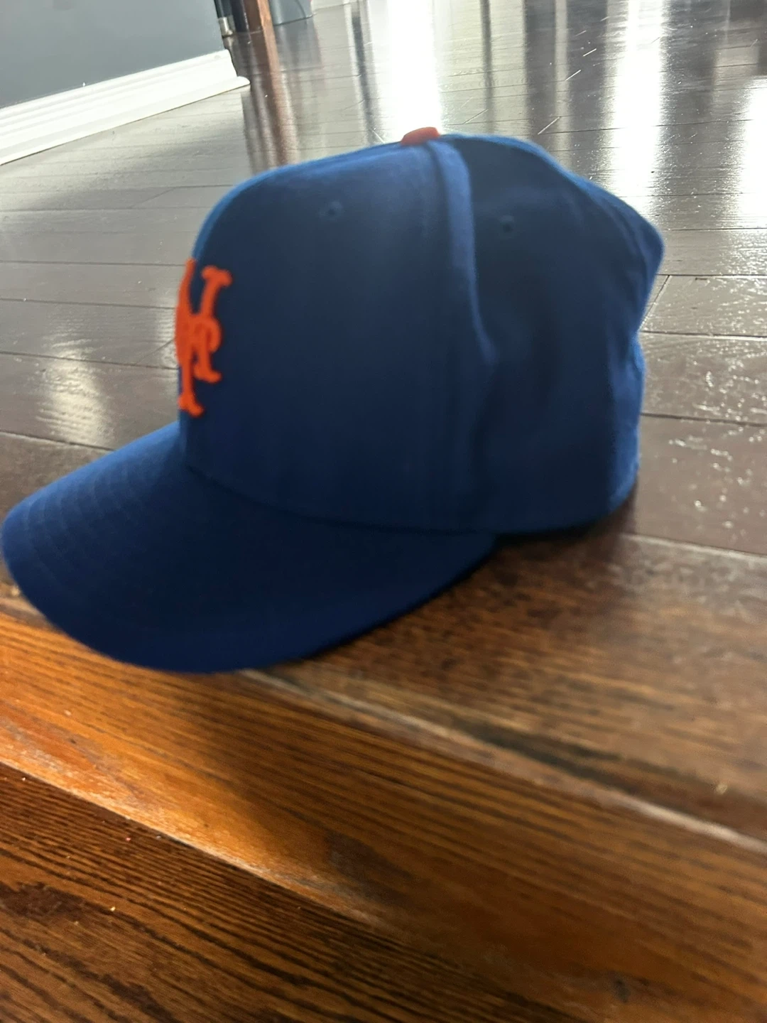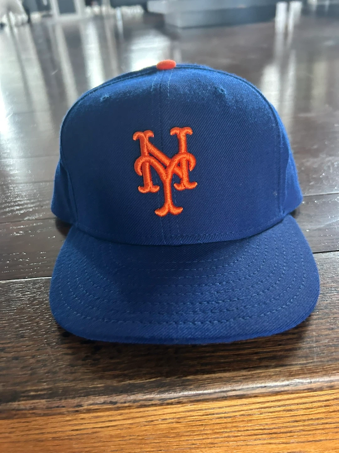 New Era New York Mets fitted baseball cap. It's a blue hat with the orange 'NY' logo and an orange button on top. The size is 7 1/2, which is 59.6cm. This cap is perfect for any Mets fan! Worn a few times