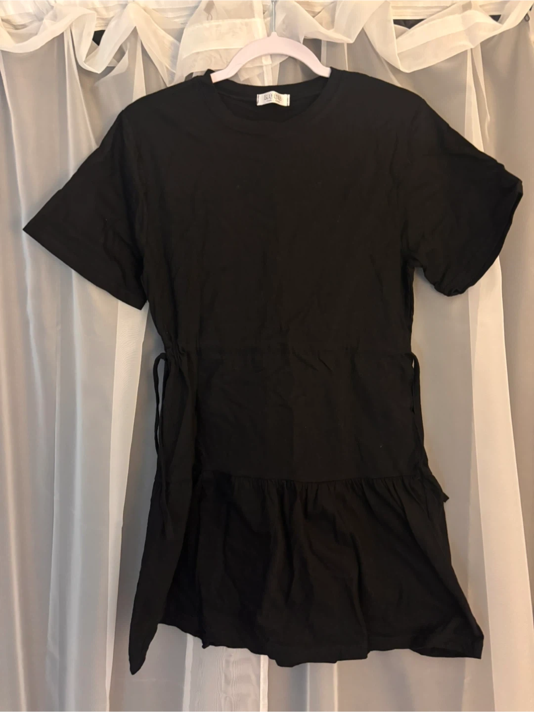 Selling a cute black dress! It's a size small and features a flattering silhouette with a ruffled hem and adjustable drawstring waist. Perfect for a casual day out or dressed up for an evening event