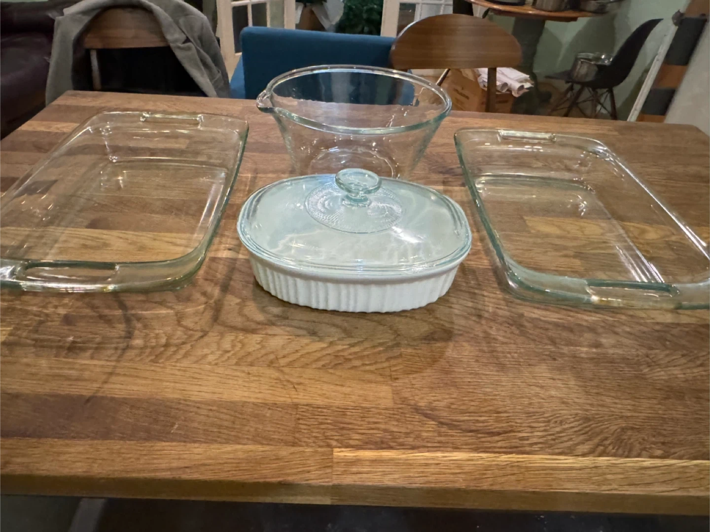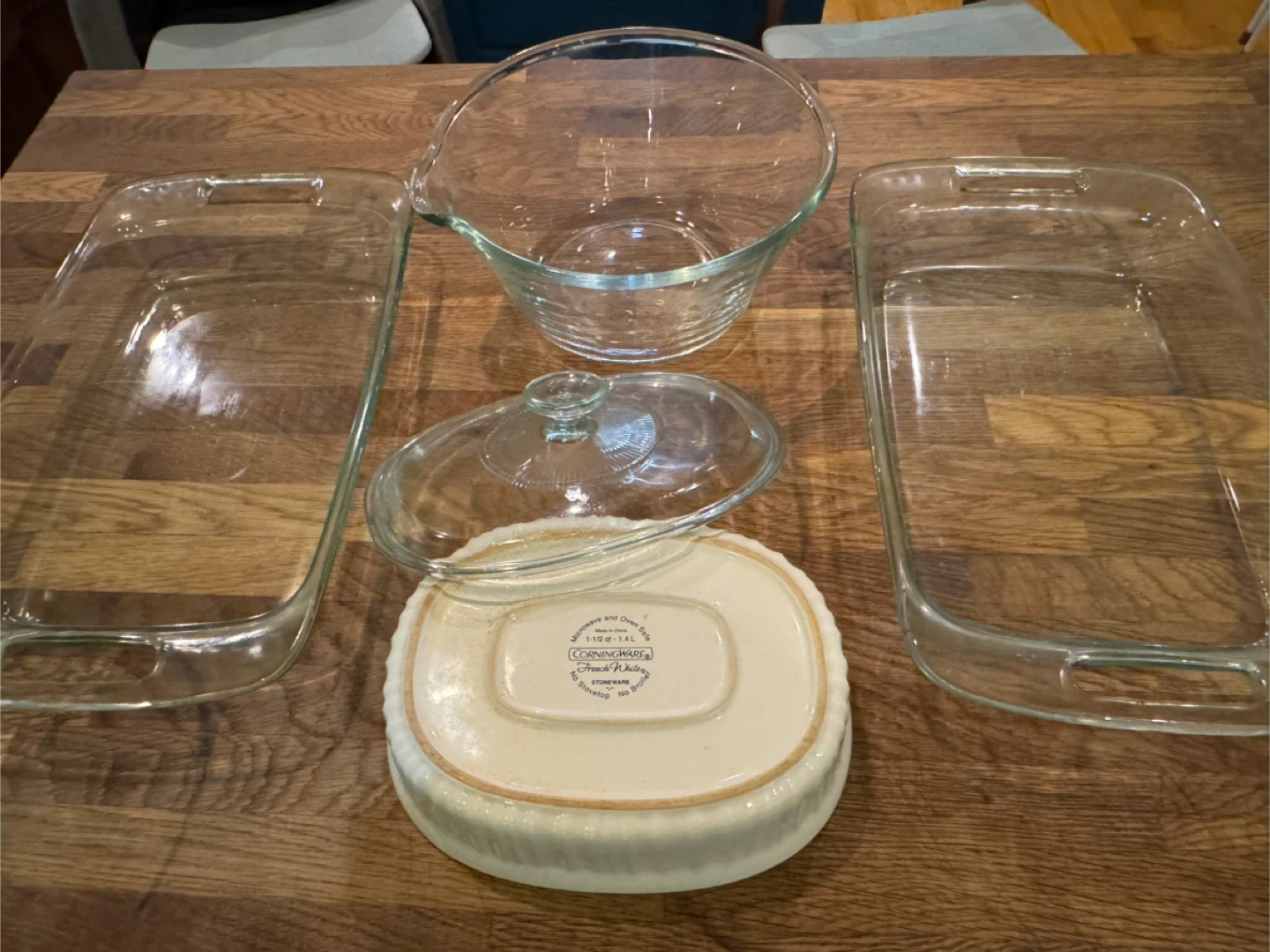 Selling a CorningWare and Pyrex glassware set! Included are two rectangular baking dishes, a mixing bowl, and a casserole dish with a lid. They're all in great condition and ready for a new home
