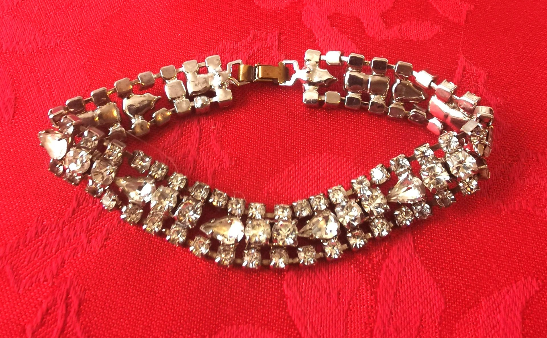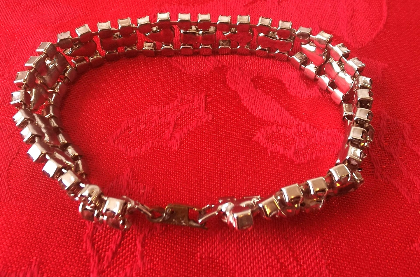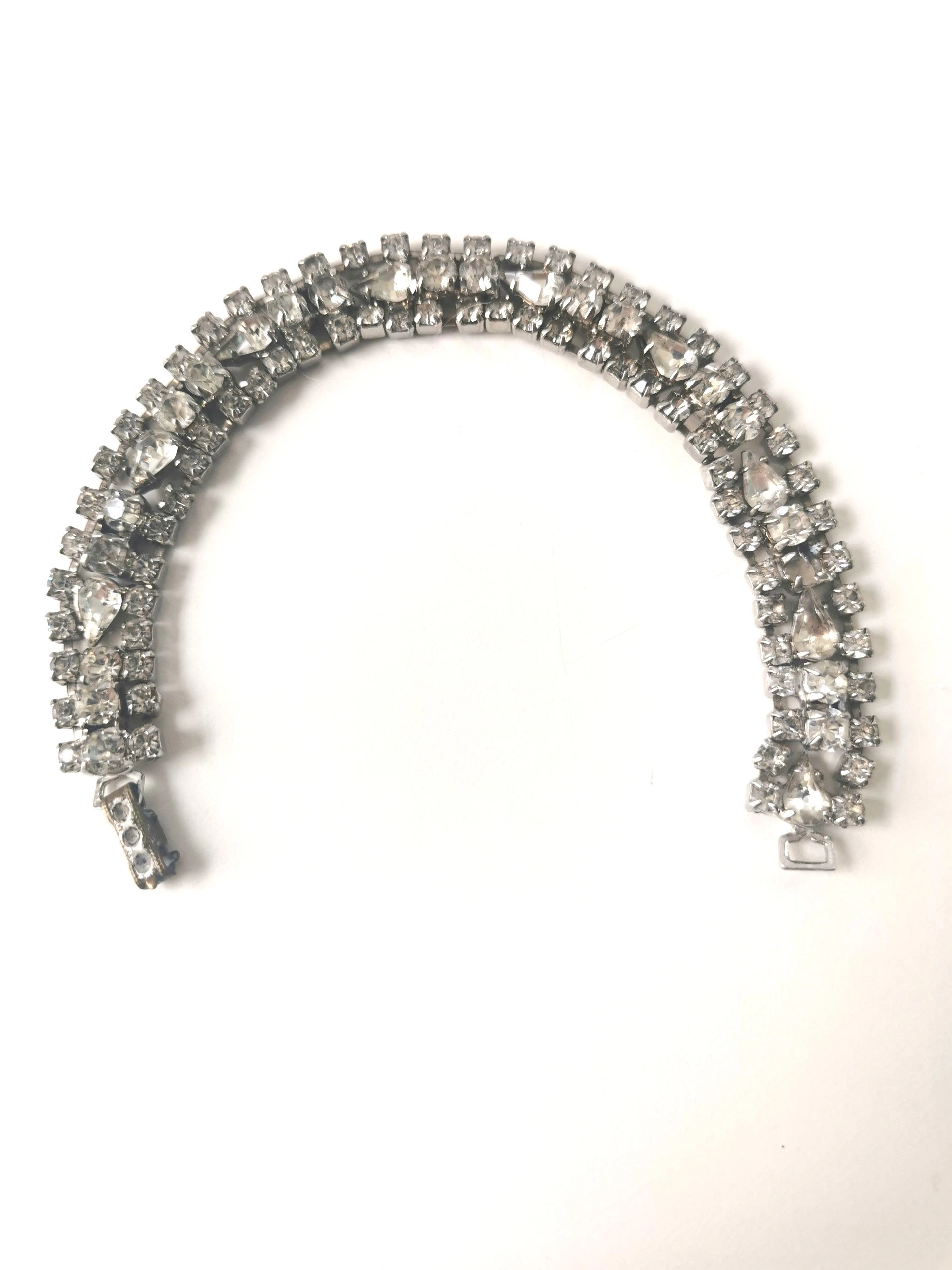 Condition: The item is in good vintage condition with light wear. All rhinestones are present and retain excellent sparkle. The rhodium plating is bright and clean with only minor surface wear on the back of the clasp, consistent with a well-cared-for piece of its age.