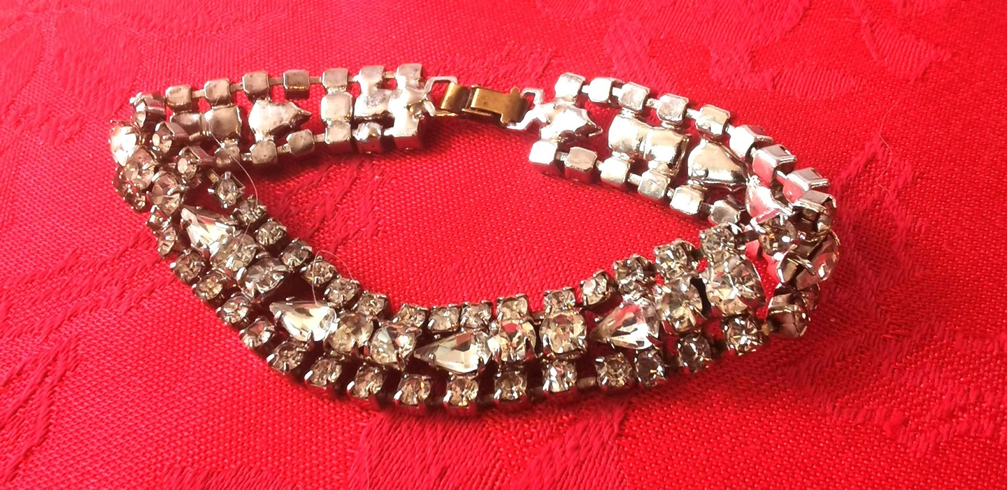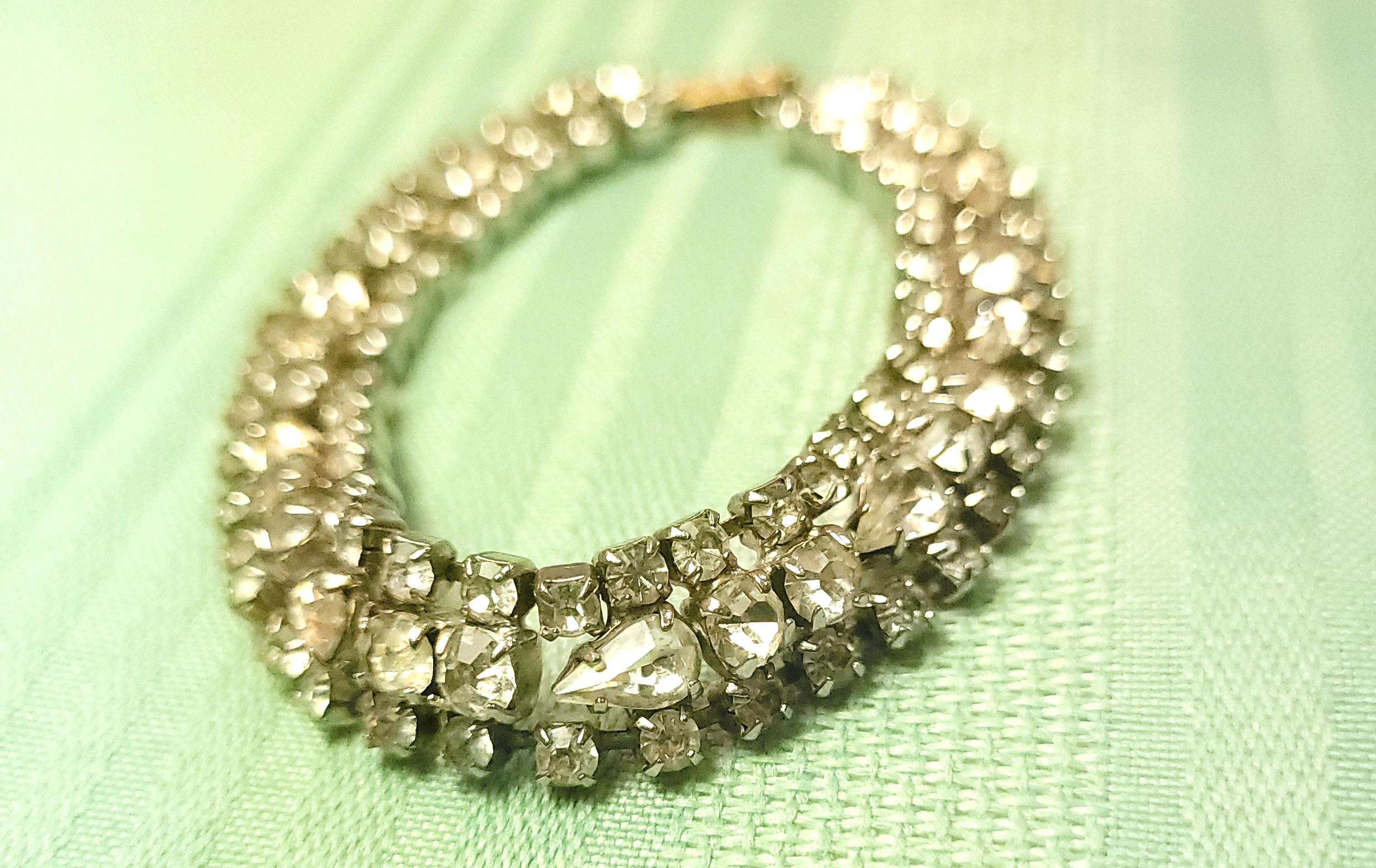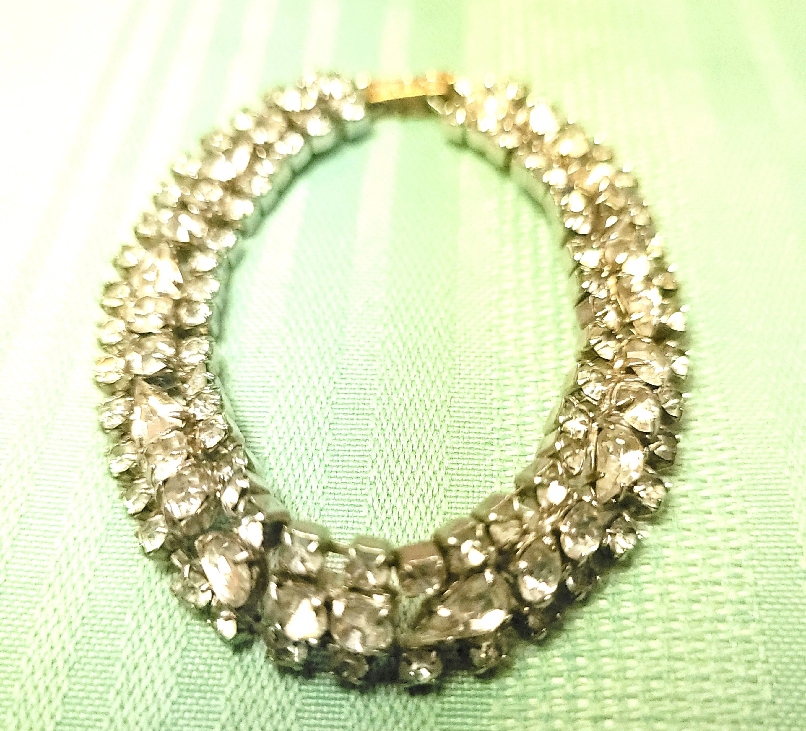 Condition: The item is in good vintage condition with light wear. All rhinestones are present and retain excellent sparkle. The rhodium plating is bright and clean with only minor surface wear on the back of the clasp, consistent with a well-cared-for piece of its age.