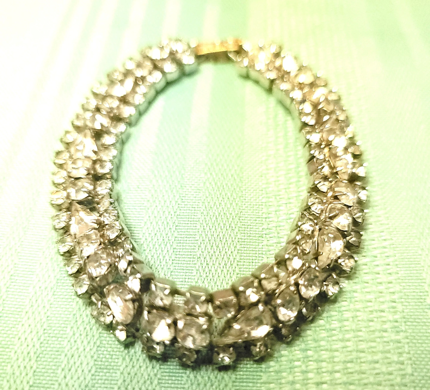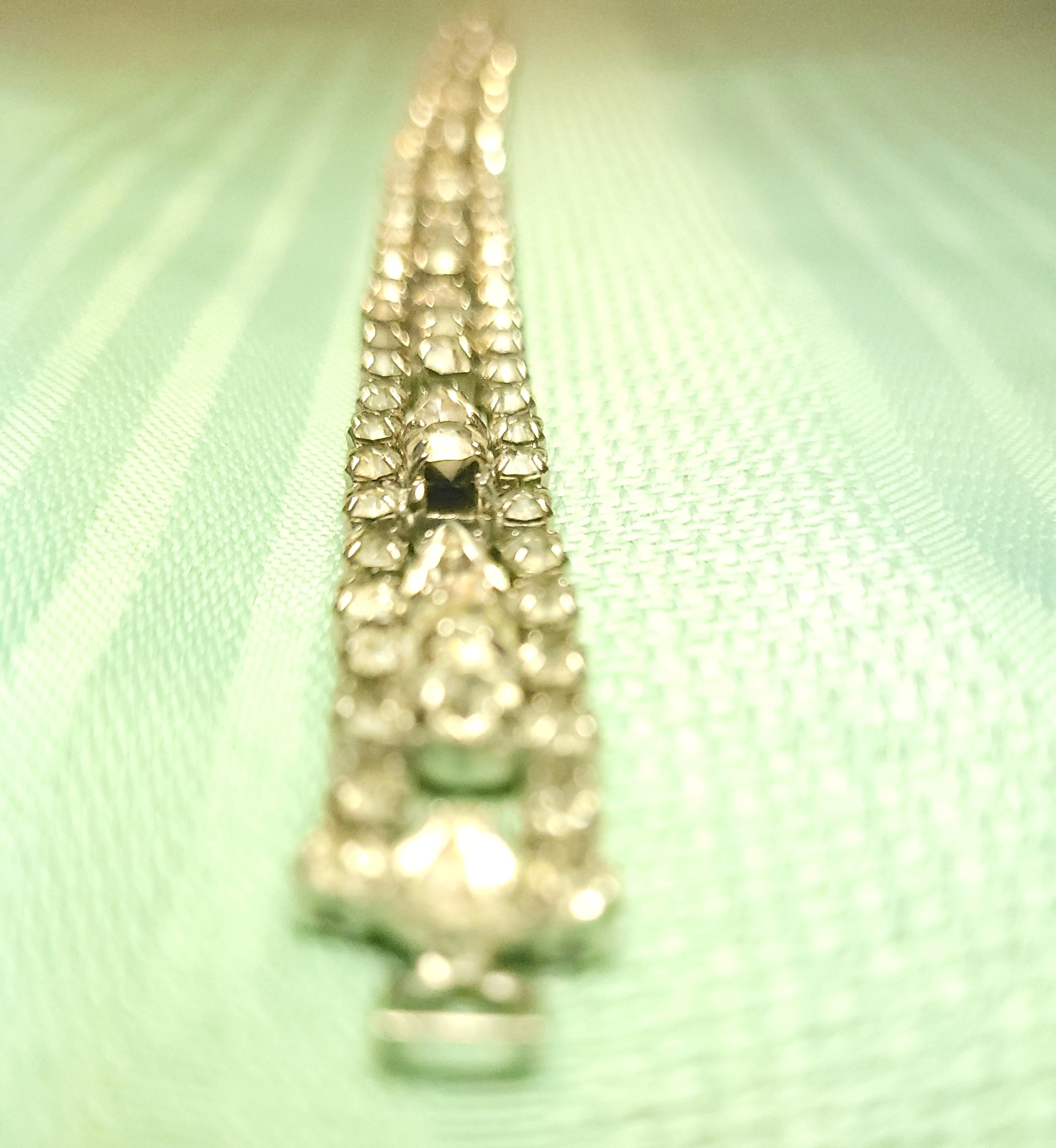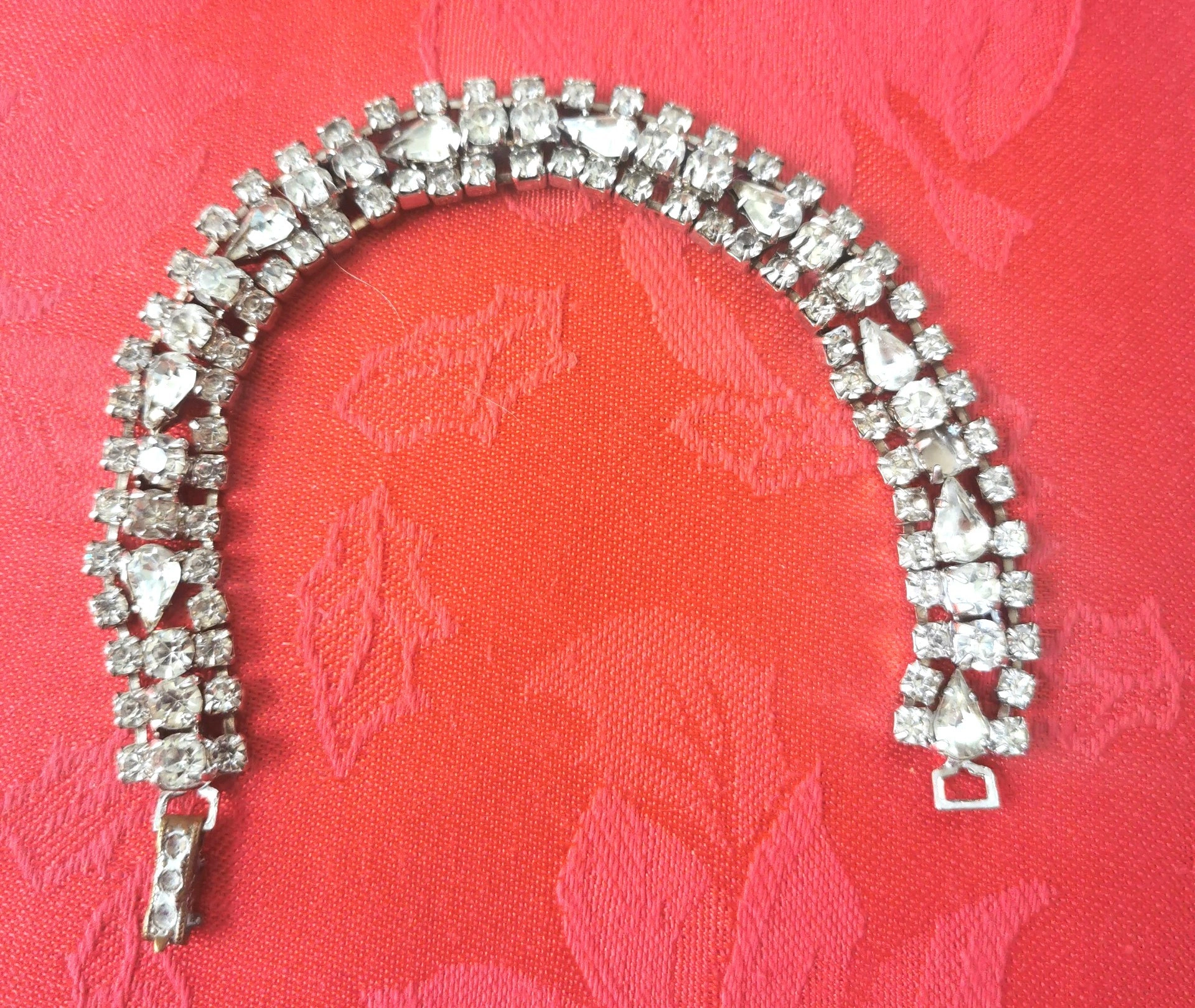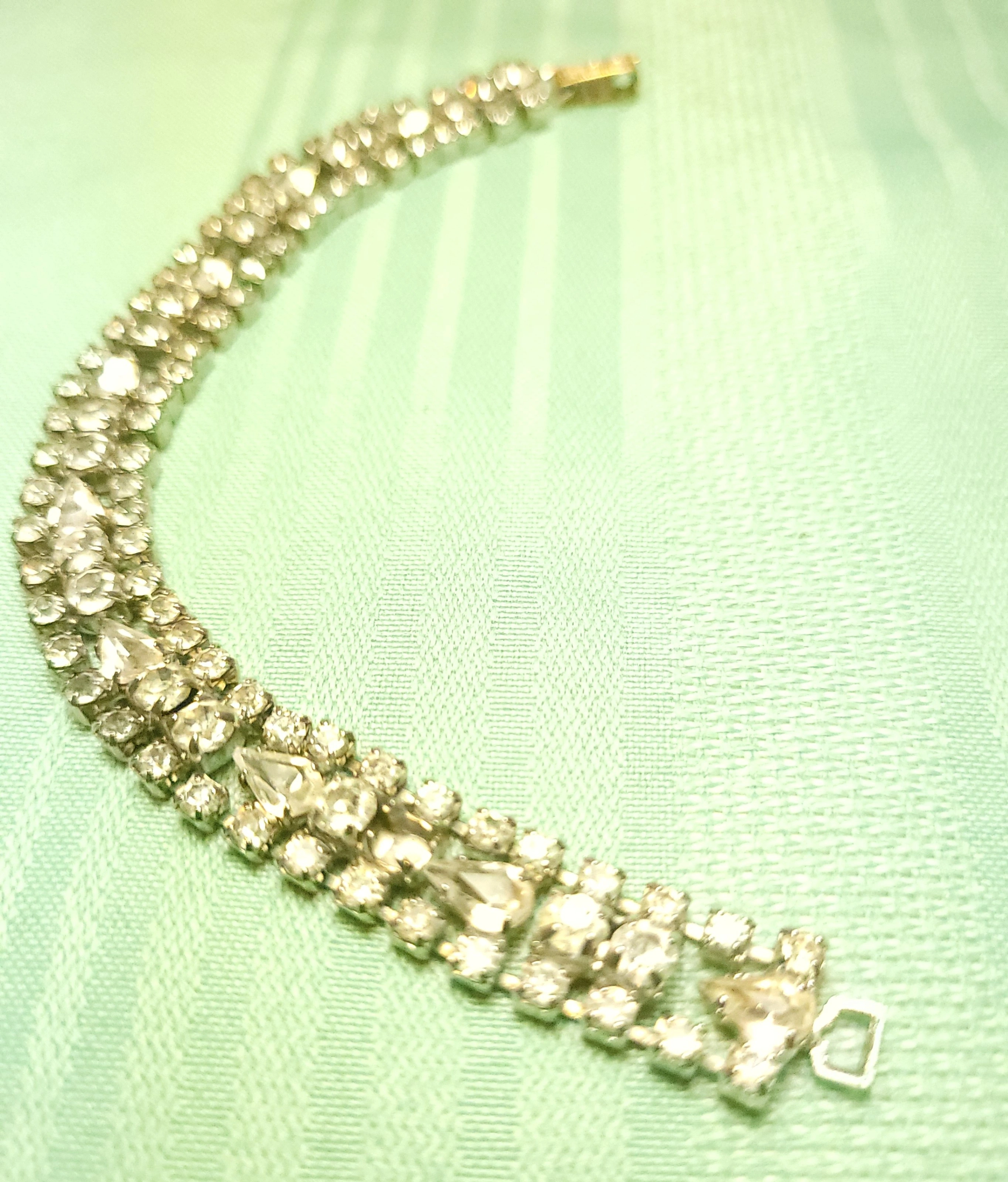 Capture the elegance of the 1950s with this exquisite "Ice" rhinestone bracelet. This piece features a sophisticated triple-row design, meticulously set with brilliant clear chaton rhinestones and accented by a stunning row of pear-shaped (teardrop) stones.
