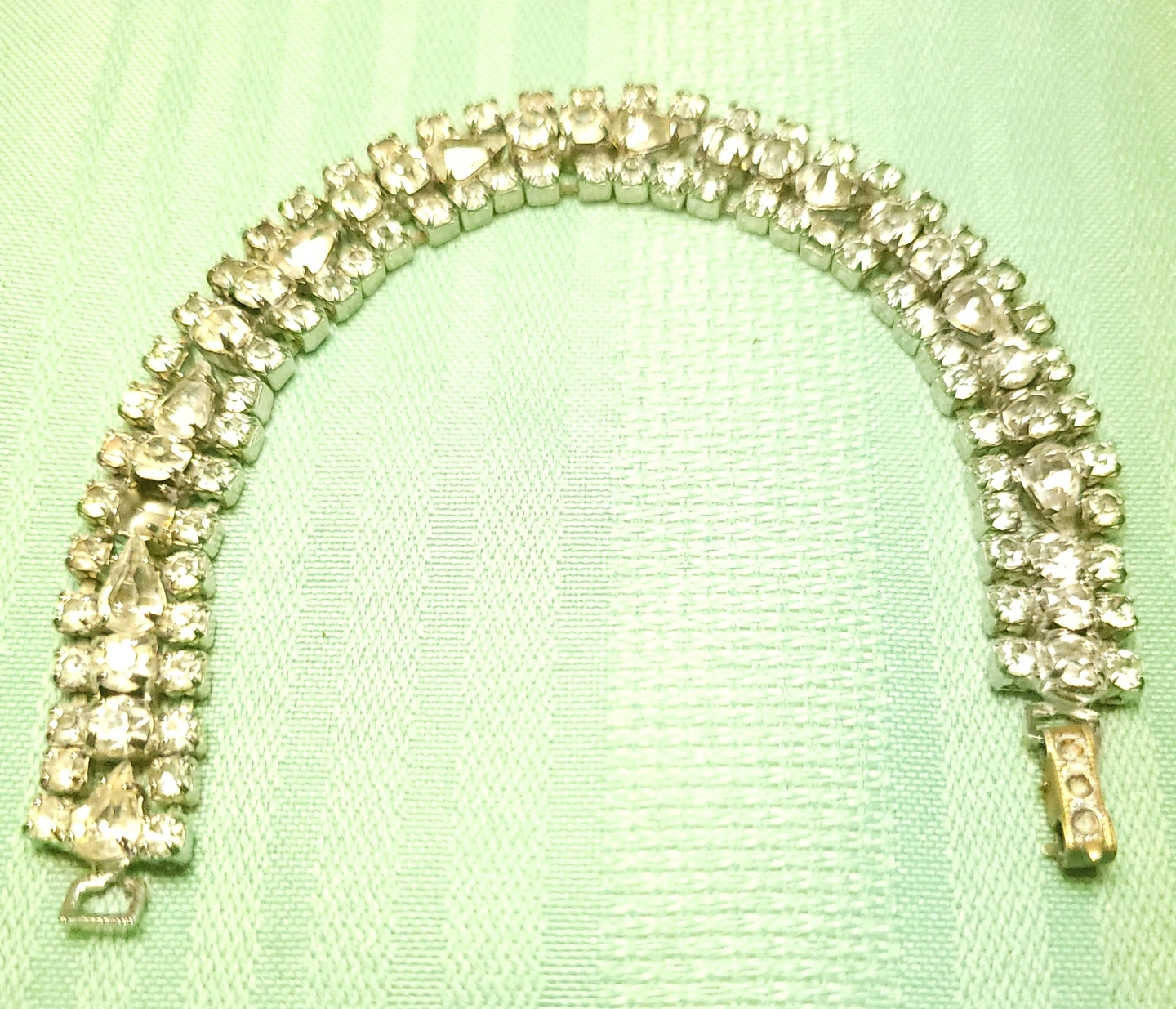 1950s Rhodium Rhinestone Bracelet 7.5" Pear Cut Mid-Century