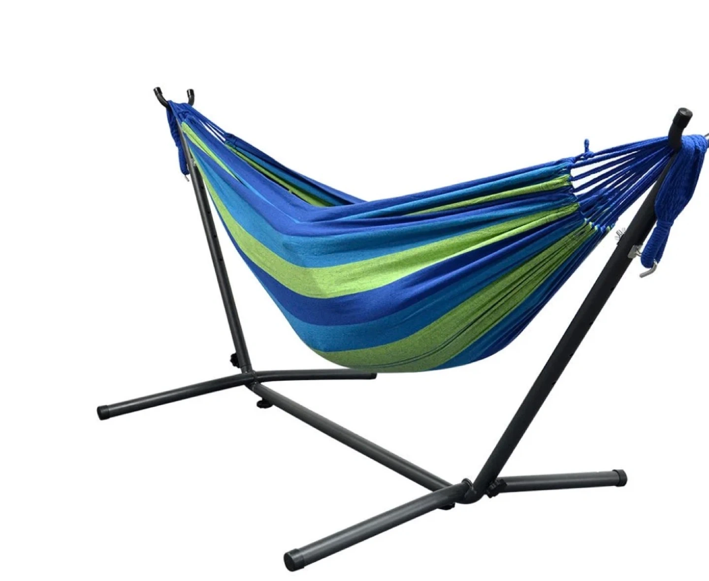 Relax in style with this hammock! The hammock features a vibrant blue, green, and white striped pattern. It's in great condition and ready for your backyard or patio.
