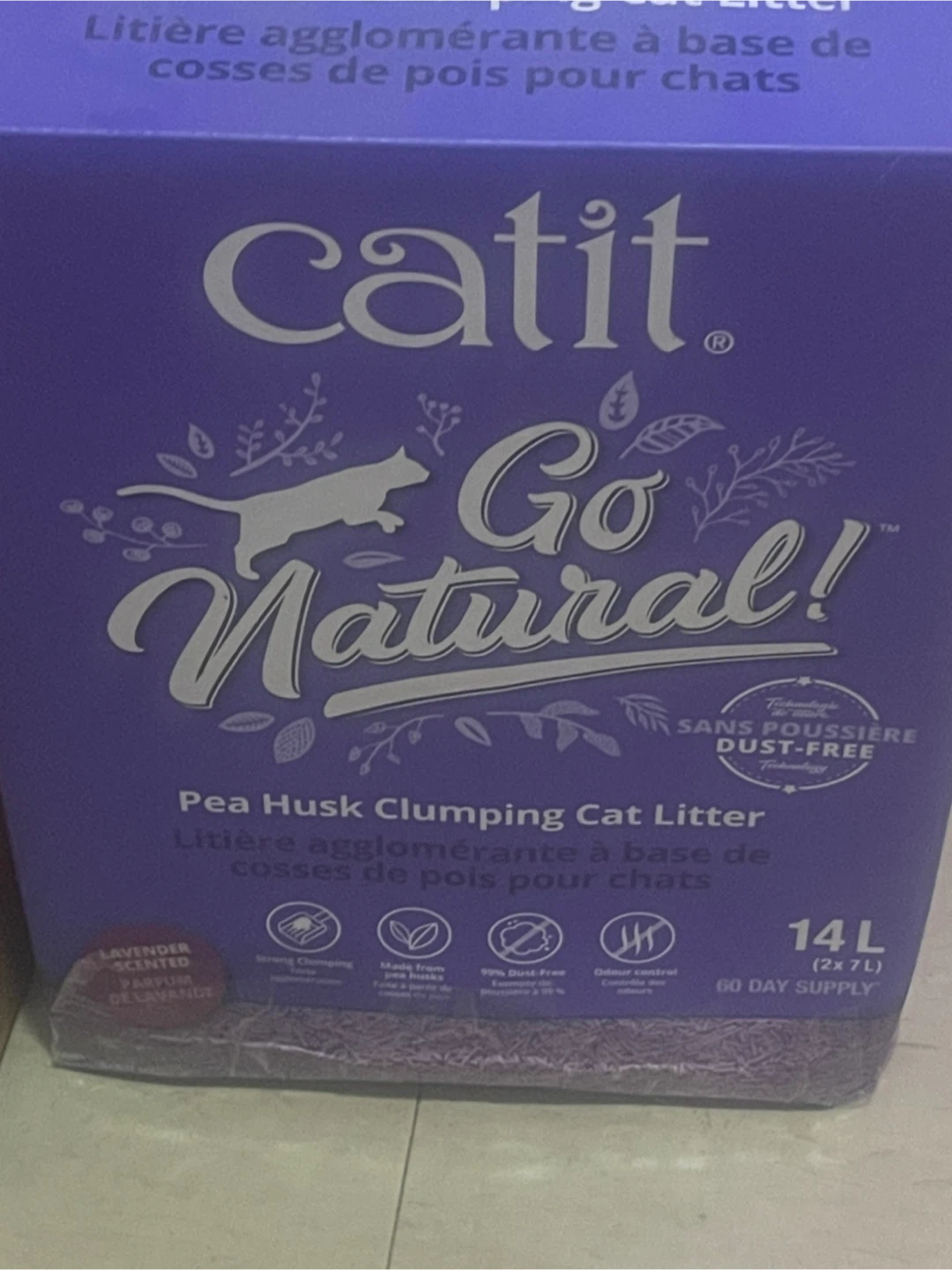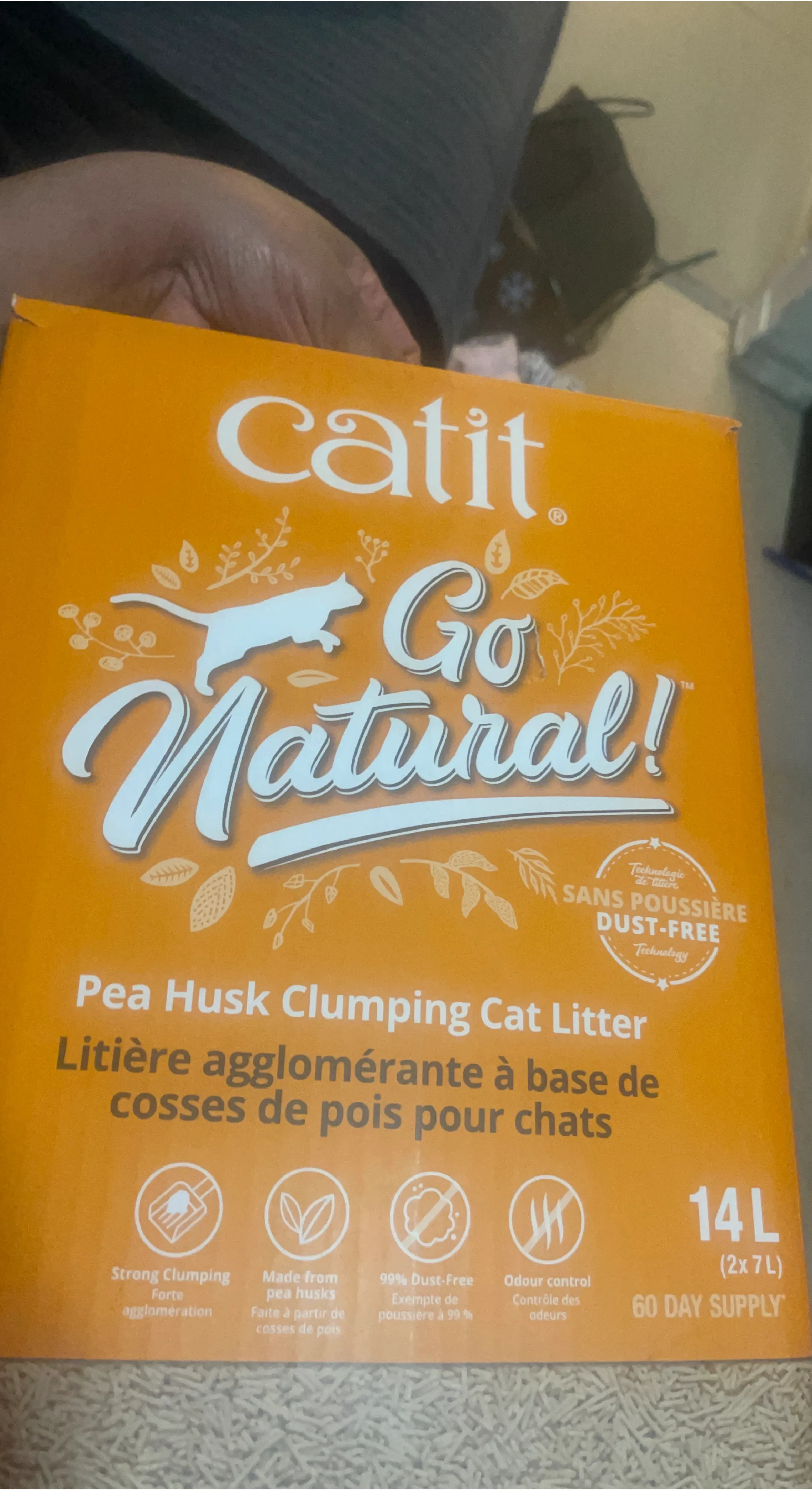 It's a 14L box of dust-free cat litter made from pea husks. It offers strong clumping and odour control, providing a 60-day supply