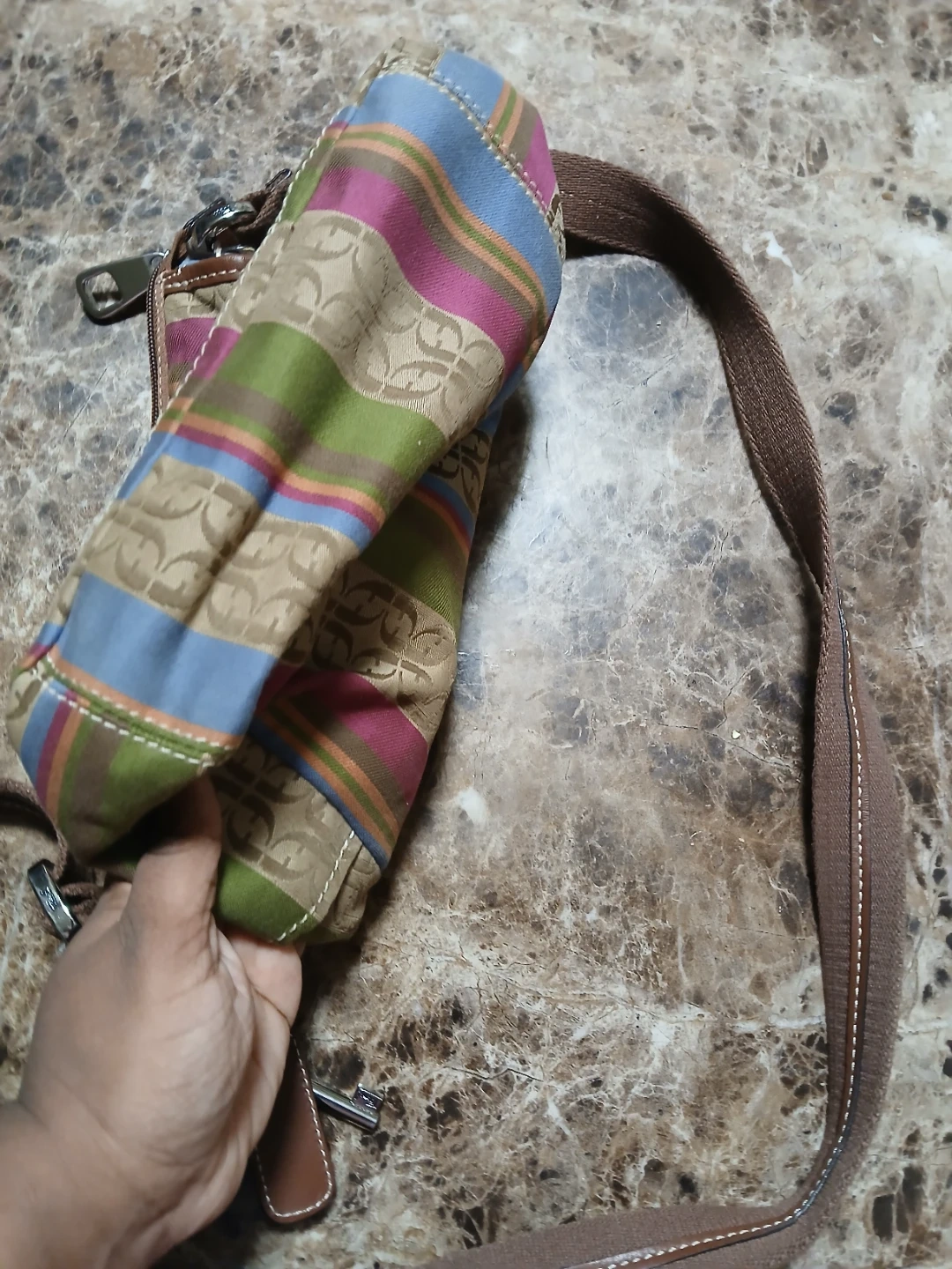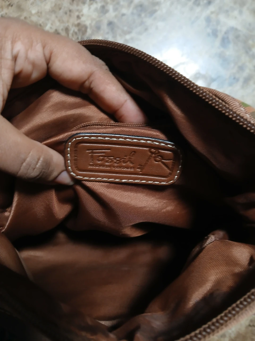 Check out this cute Fossil crossbody bag! It features a stylish striped design with a brown leather trim. The bag has a convenient zippered front pocket and a spacious interior. Price is firm plz. Pick up midland and Danforth or 401 bay street or stc mall