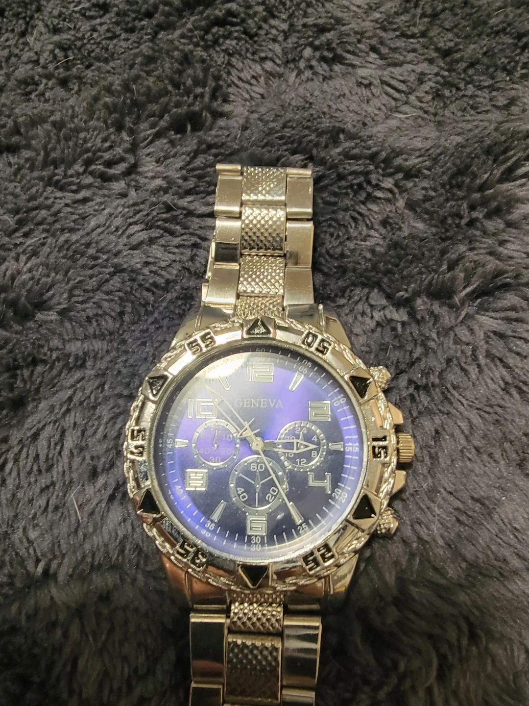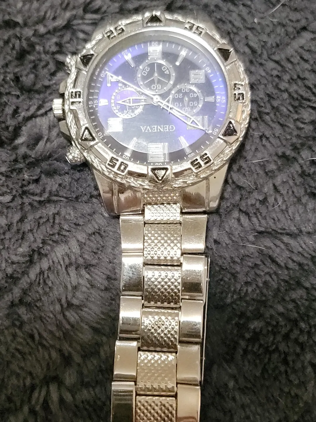 Selling a Geneva watch with a silver tone band and a blue face. It has a chronograph style dial. The watch is in good condition and ready for a new owner!