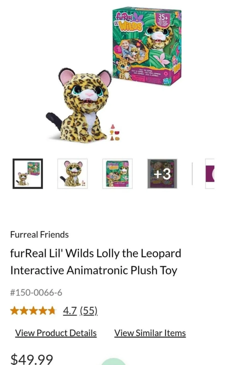 Selling a FurReal Lil' Wilds Lolly the Leopard Interactive Animatronic Plush Toy! This adorable plush toy is ready for a new home. It comes with its treats and makes over 35 sounds and reactions. Ages 4+
