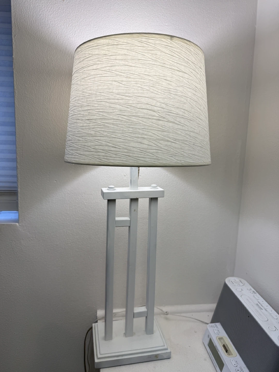 Selling a simple white table lamp. It has a textured white shade and a white base with a minimalist design. Perfect for adding a soft glow to any room!