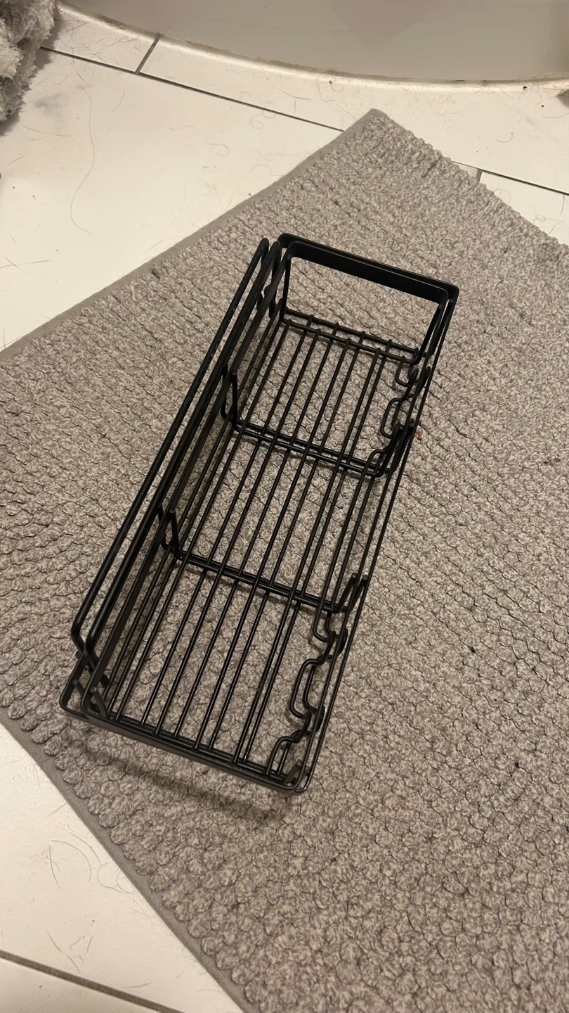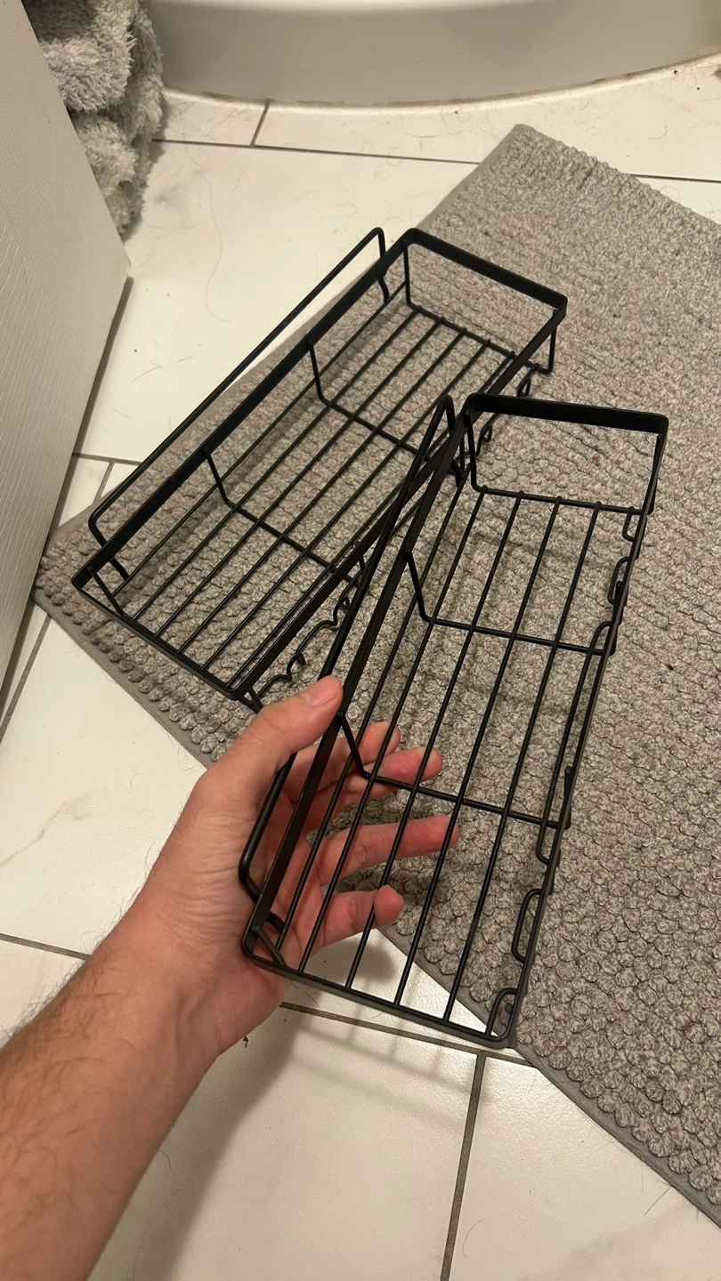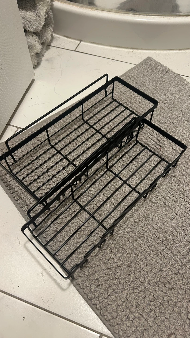 Selling a set of two black wire storage baskets. They're great for organizing small items in your bathroom.
