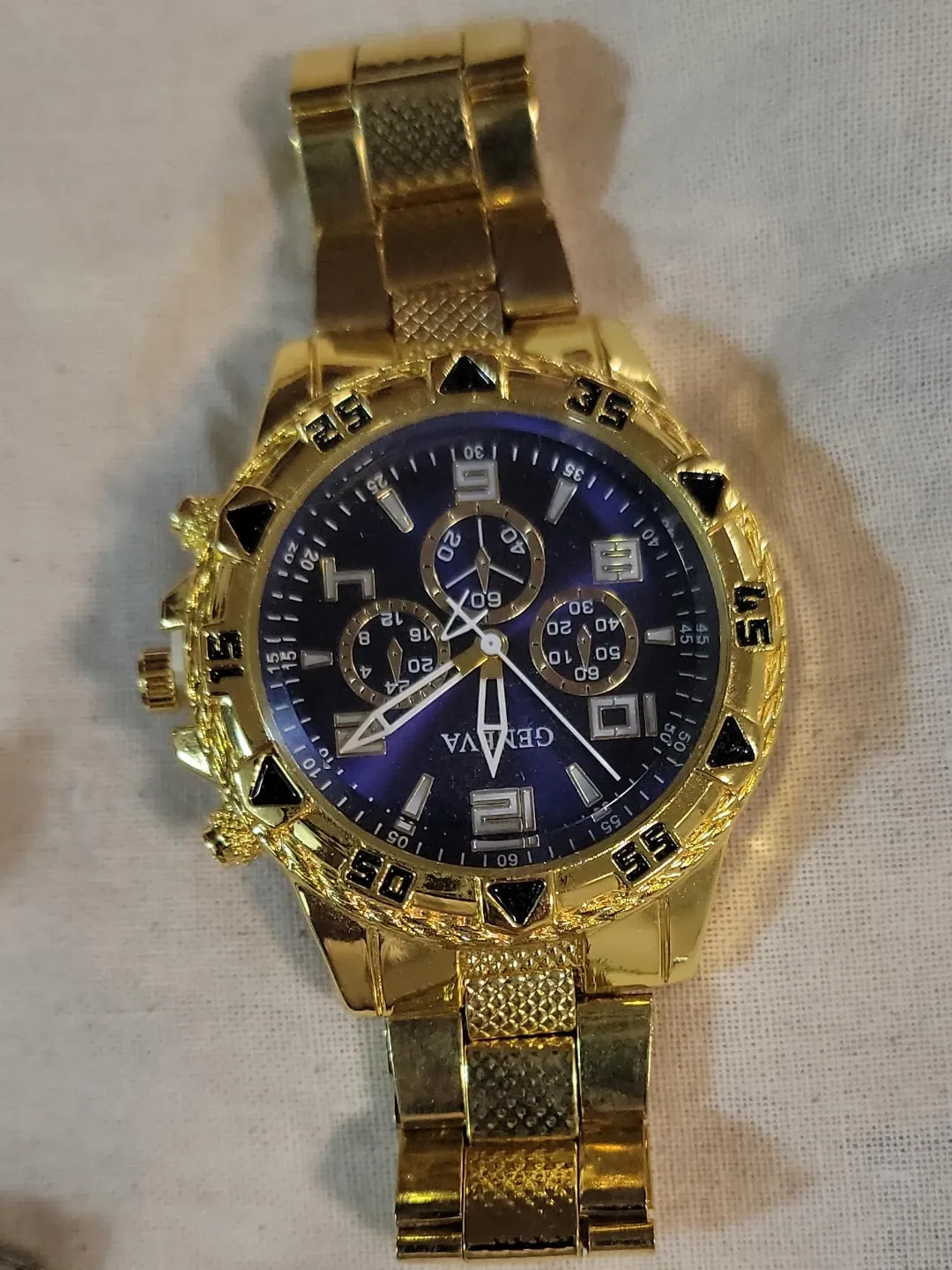 Selling a stylish Geneva watch with a gold-tone finish. The watch features a blue face and a detailed dial. A great accessory to add a touch of elegance to any outfit