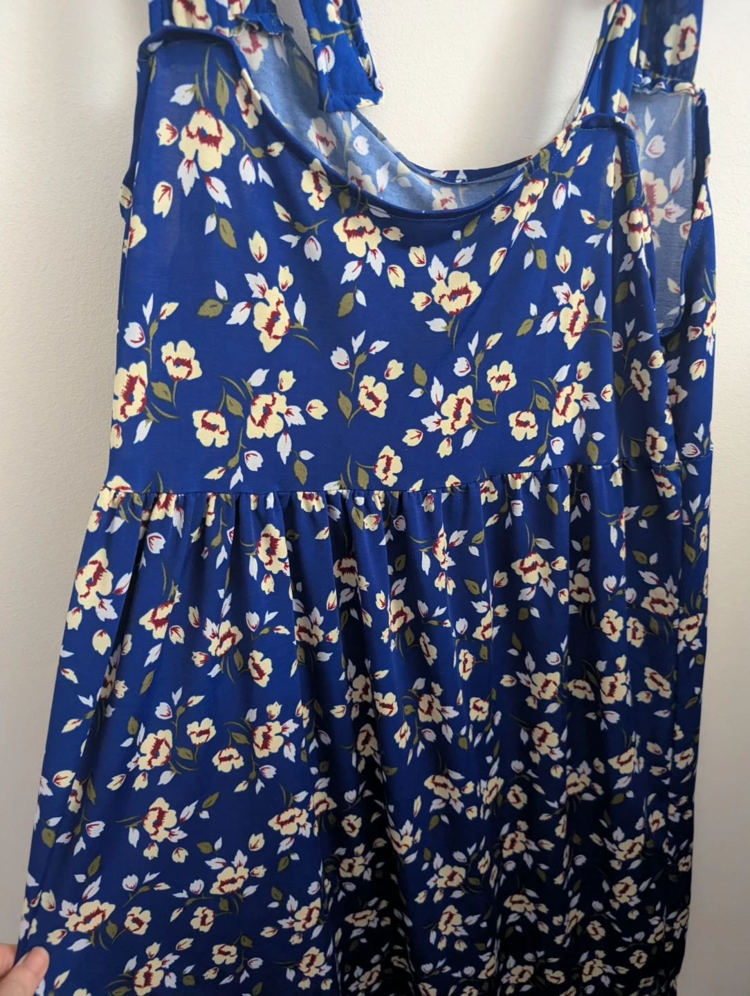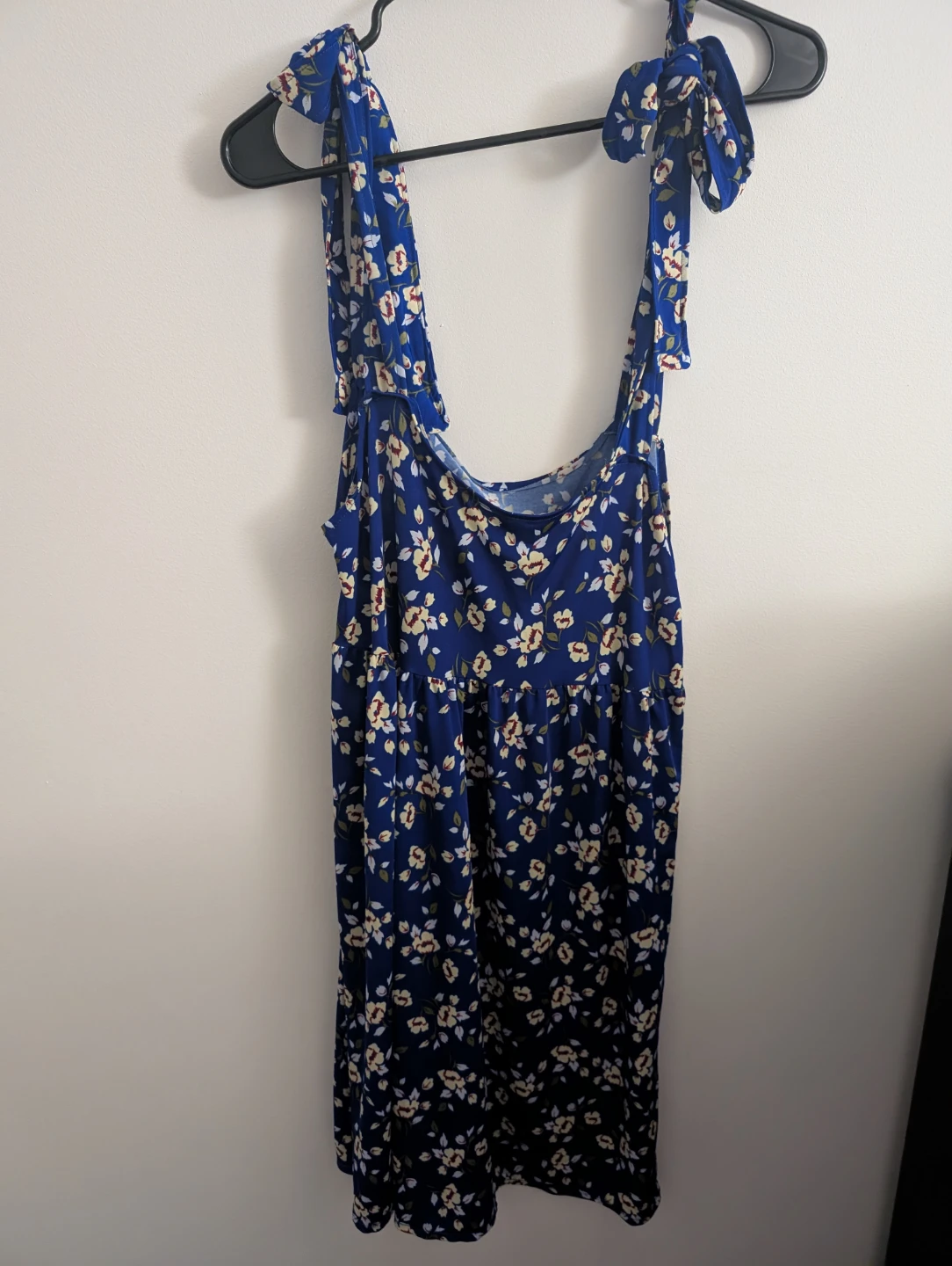 Cute blue dress with a floral print! It has tie straps and is in great condition