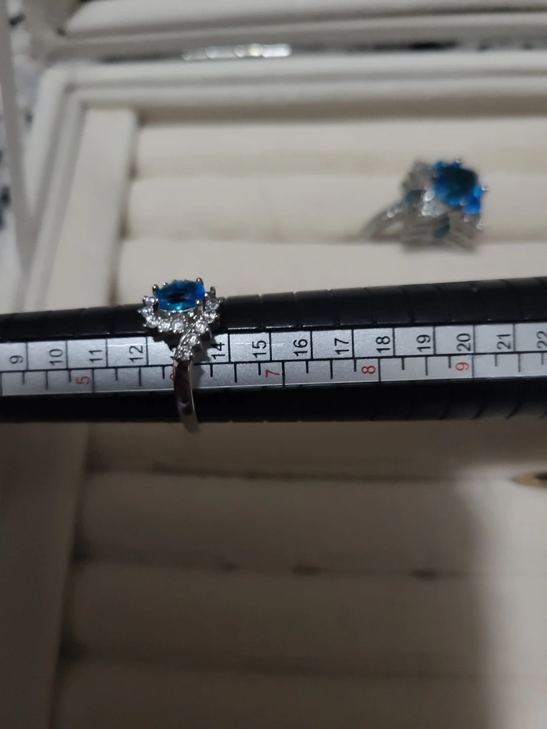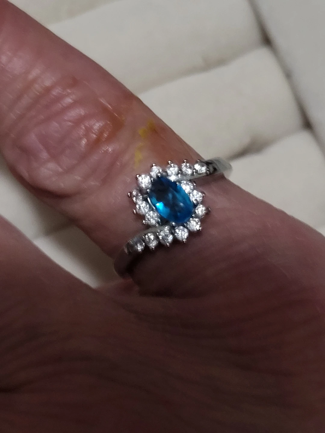 Selling a beautiful ring featuring a blue gemstone surrounded by smaller clear stones. The band is marked as sterling silver 925. It's approximately a size 6.5