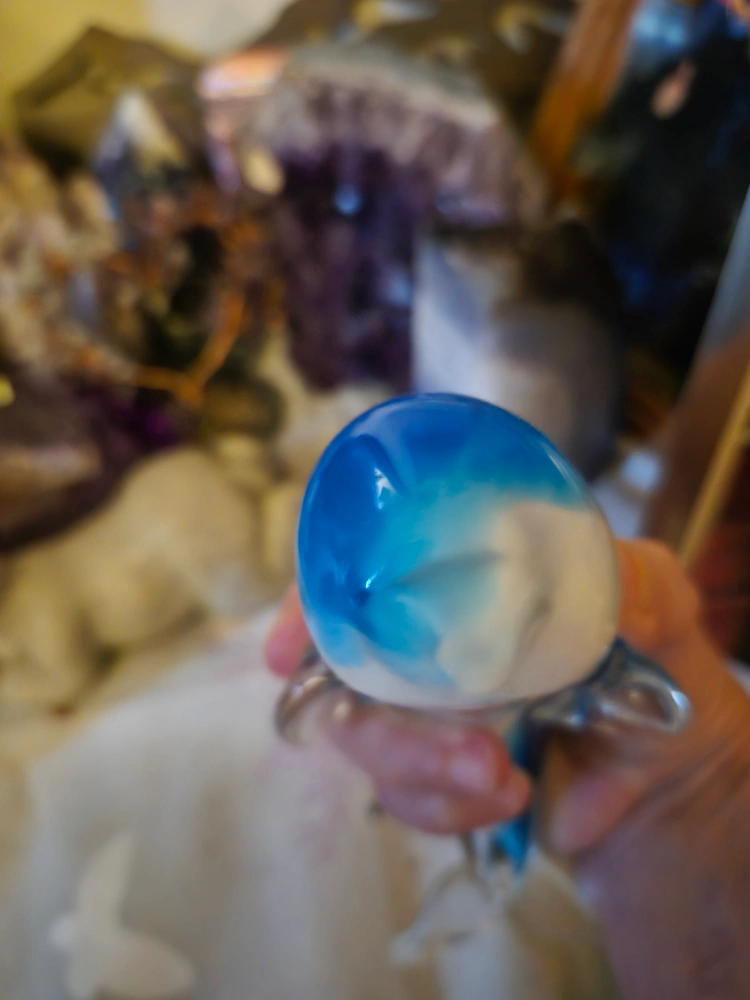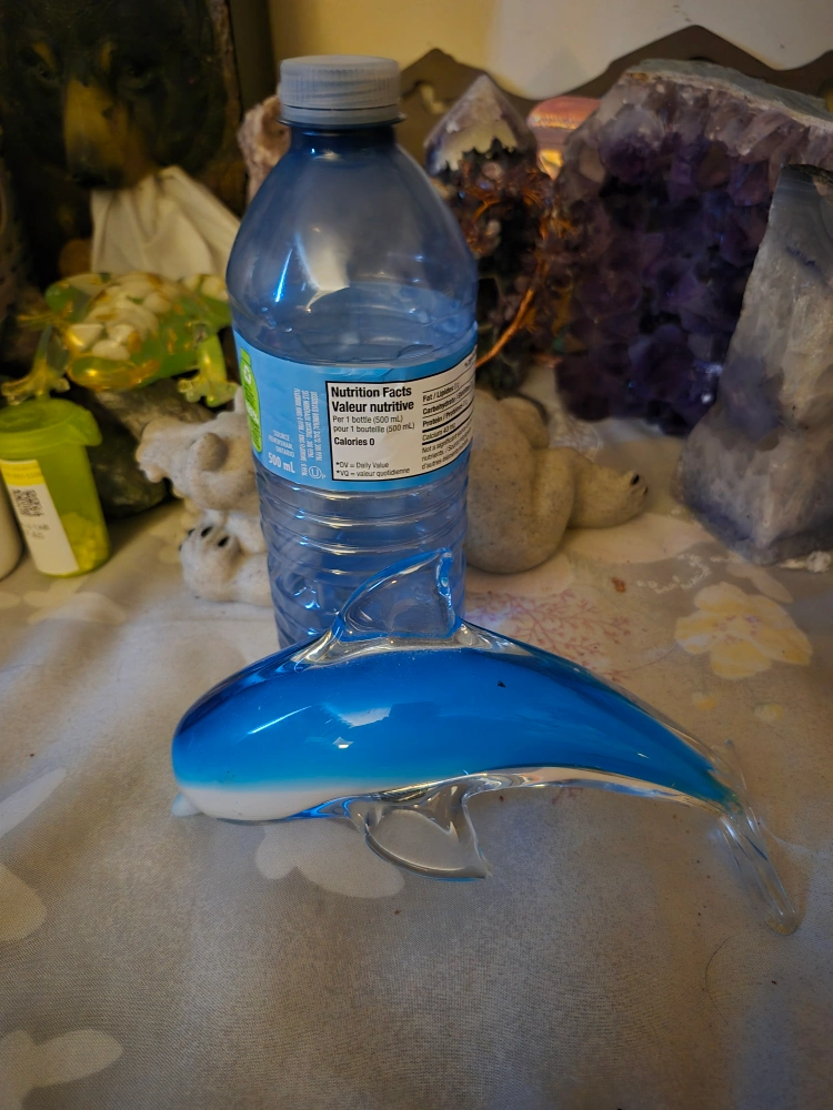 Here's a lovely blue and clear glass dolphin figurine! It's in great shape and would look great on a shelf or desk. A unique piece to add to your collection